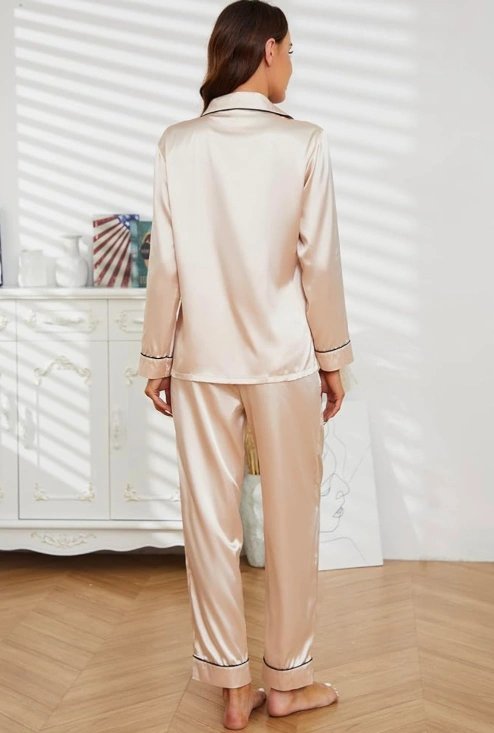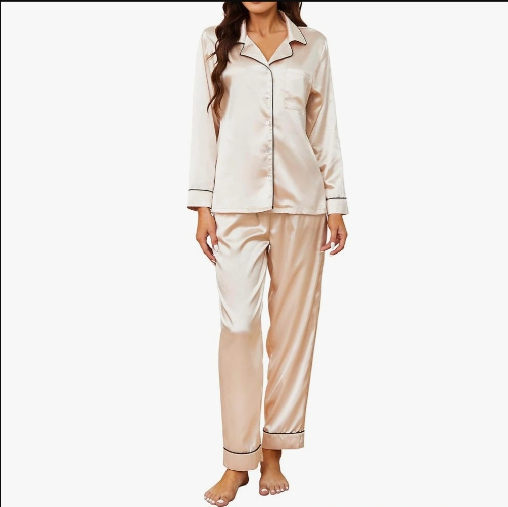 A beautiful and comfortable satin pajama set in a lovely champagne colour! Perfect for a cozy night's sleep or lounging around the house. The material feels so smooth and luxurious