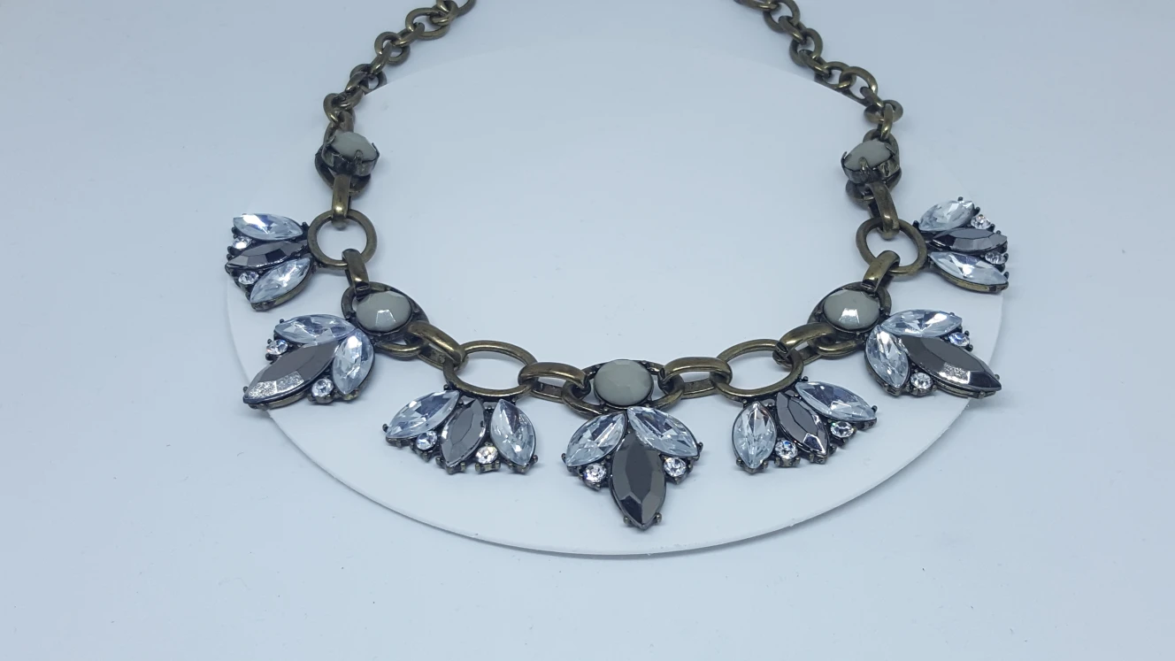 Unique costume jewellery, large gems make flower like designs, with white, Dark, and muted stones. Chain is good coloured with large links. This piece could be the drama your outfit needs ๐ Pick up preferred at SW corner of Dundas Street West & Brock Ave (benches available). If you are close by, drop off to your location is also an option, pls ask. *Clean item, ready to wear.
