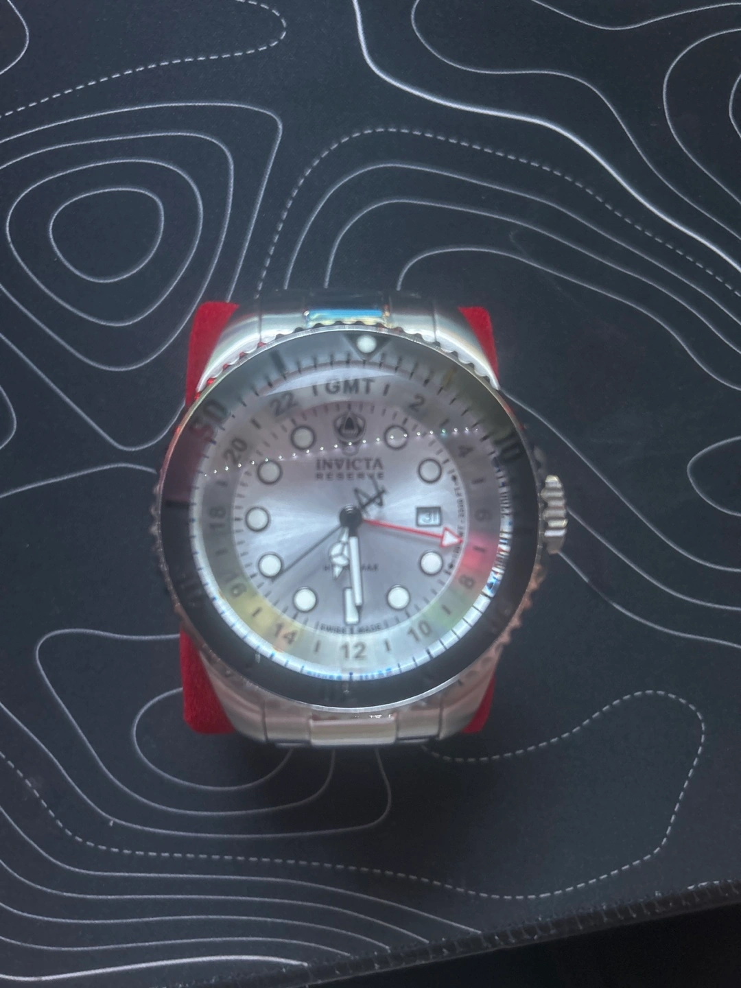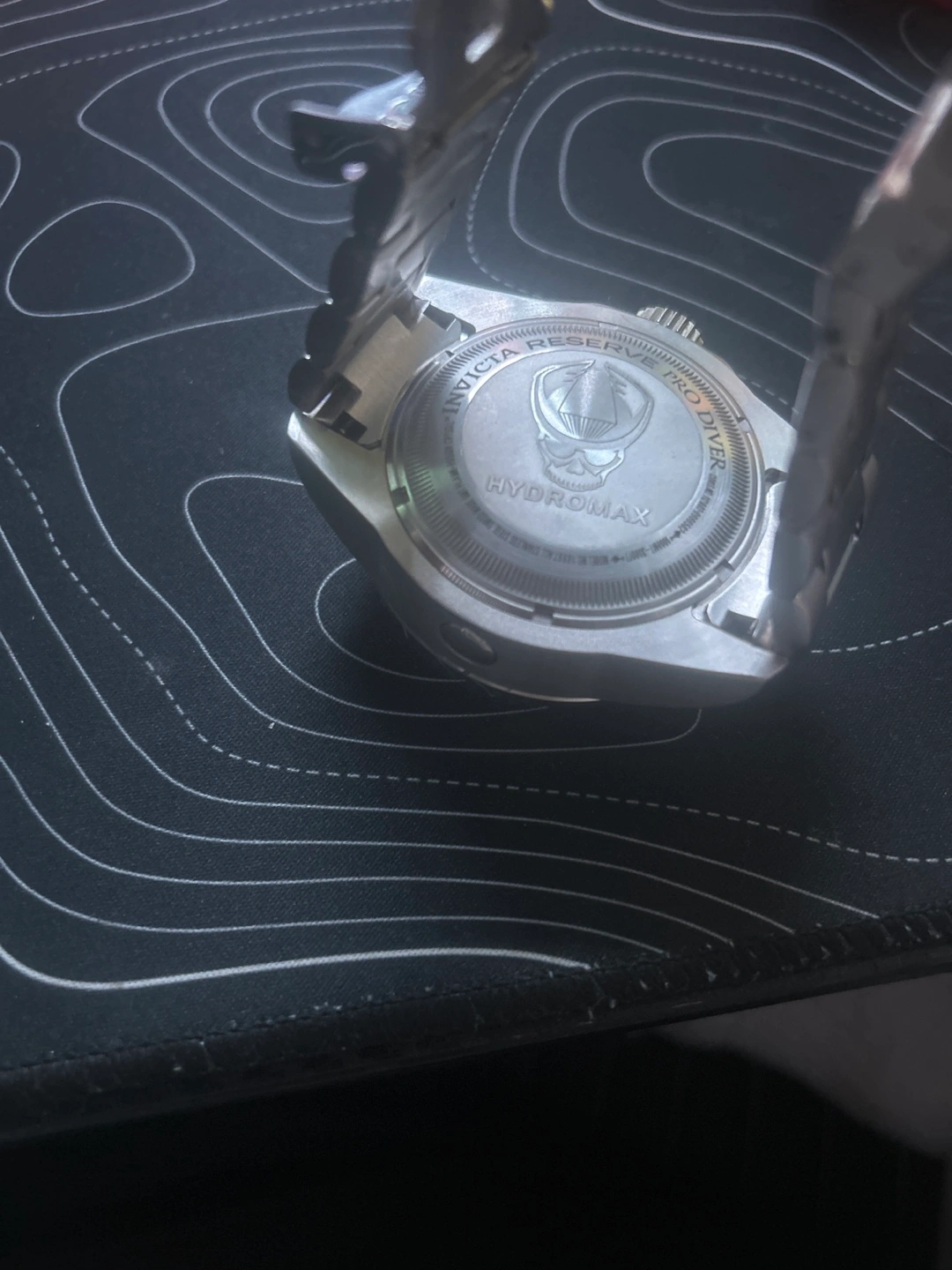 Selling an Invicta Reserve Pro Diver Hydromax watch. It features a silver band and a unique design on the back. The watch is in good condition and ready for a new home!
