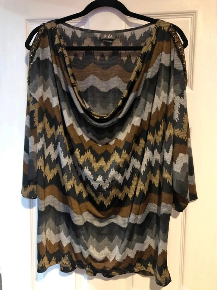 This unique top has a chevron pattern, bronze tones, and beading on the open shoulders. The fit is a bit roomier so the sleeves fit a bit lower down and the hem isn’t quite tunic length but is longer than a standard top. It has a cowl neck and everything stays pretty open and roomy while not being overly baggy. It’s a pretty cool top, especially for dressing up jeans or jeggings. Pair it with a boot and you’re all set! Cash only please. Crossposted.