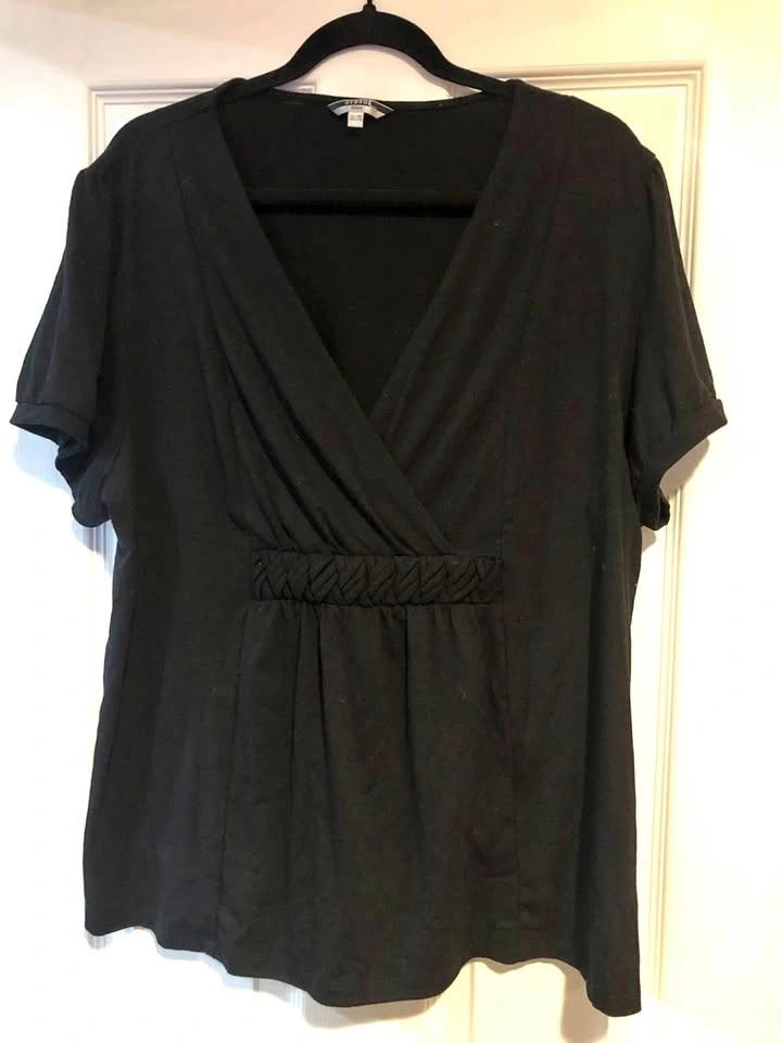 A twist on a basic tee, this black shirt has a braided underbust, adding an extra flair. Cash only. Crossposted.