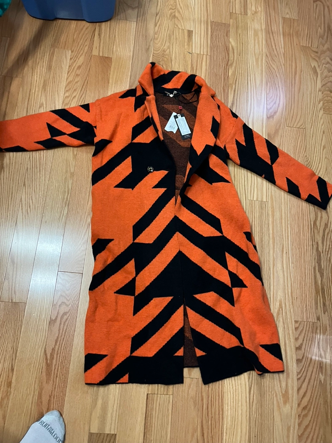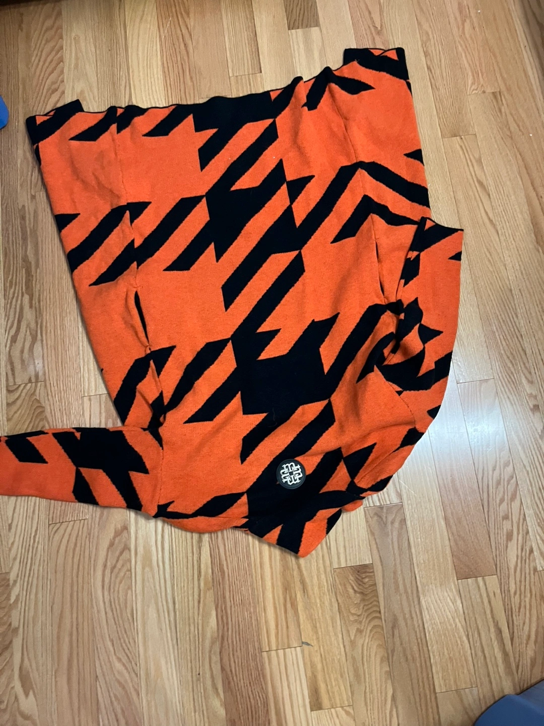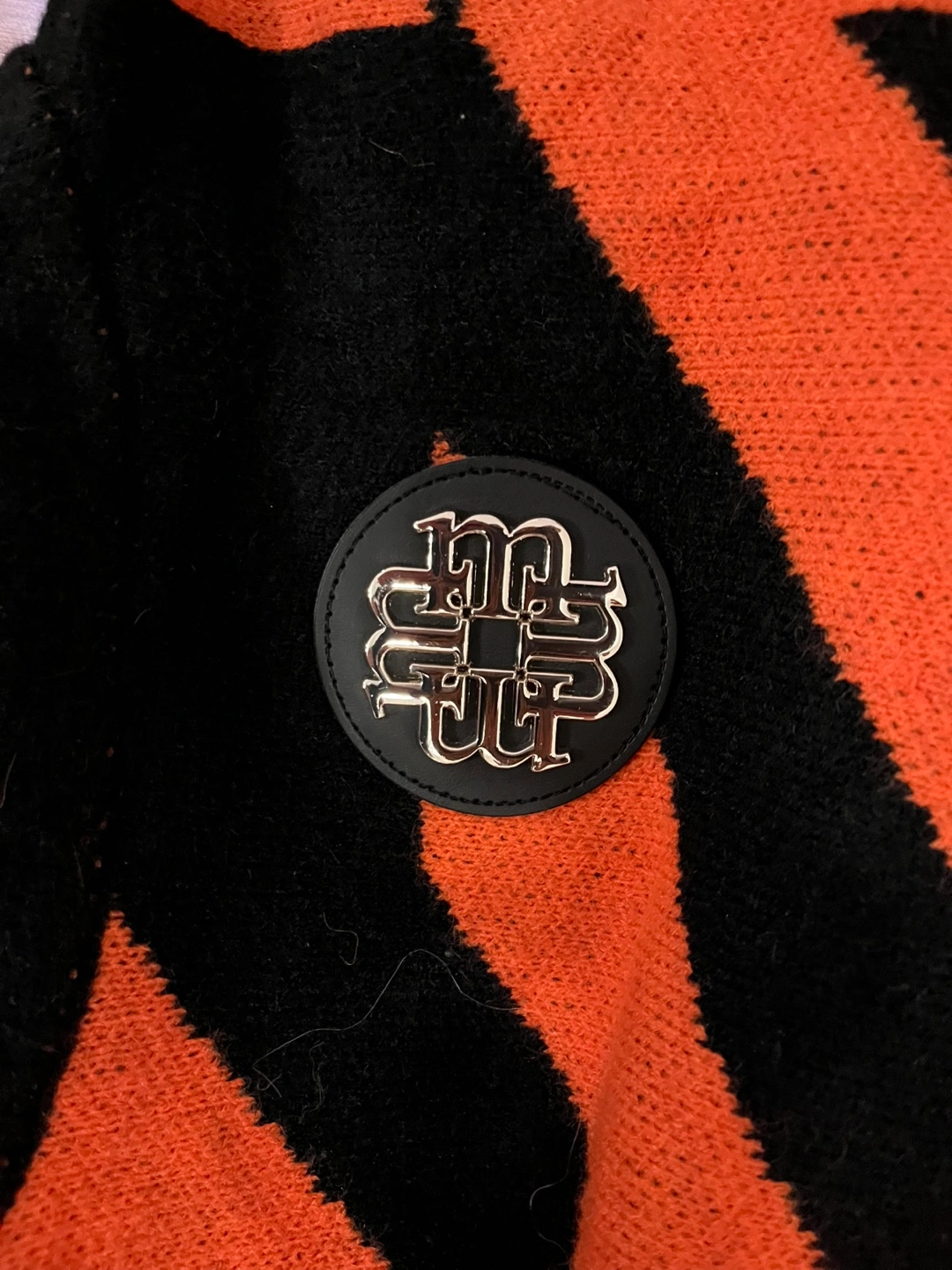 This cozy Mugler cardigan features a striking orange and black pattern. It's in great condition and ready to keep you warm this season!