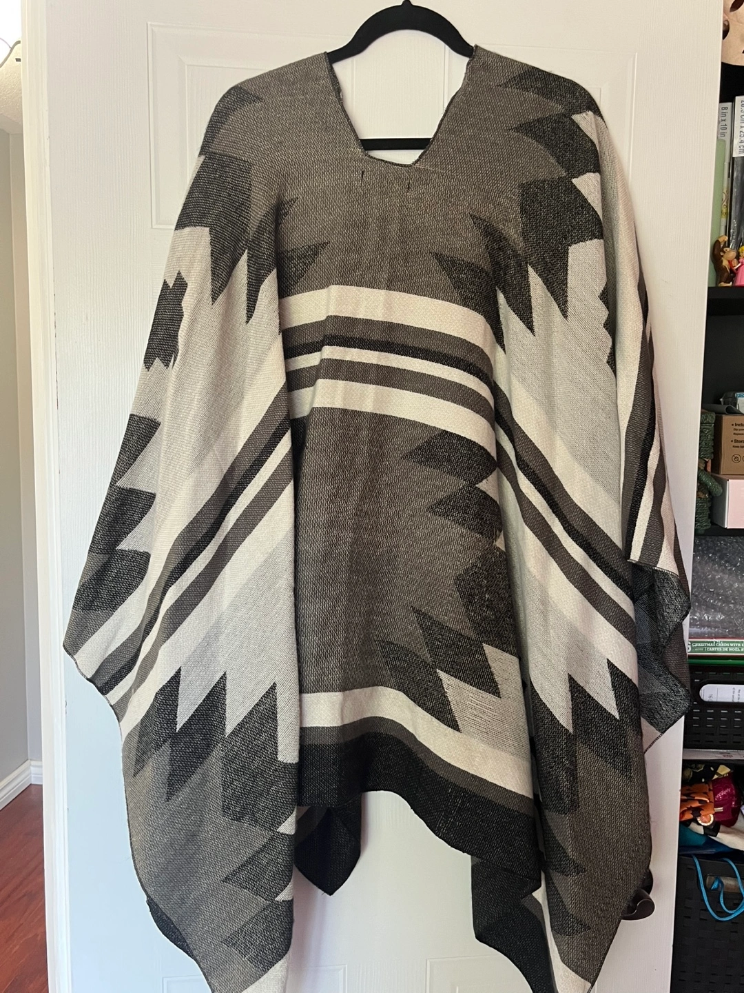 Selling a Revamped poncho in neutral tones. It's a one-size-fits-all item. Originally bought for $24.99, this poncho is made in China from 100% acrylic