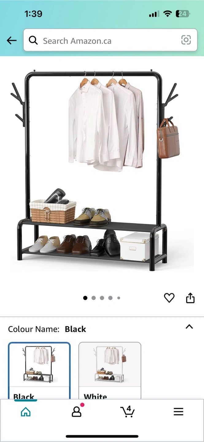 This black metal clothes rack is perfect for adding extra storage to your space! It features a hanging rod for clothes and shelves for shoes or other items. A great and sturdy piece to organize your wardrobe!