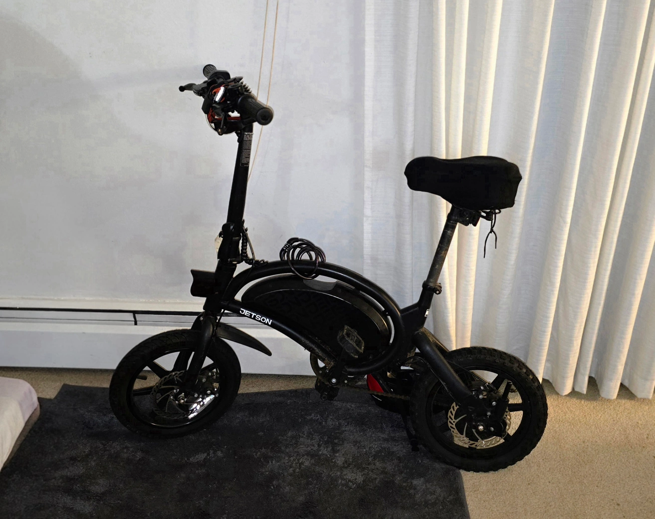 Selling my Jetson E-bike pro. Charger will be included. ✅️Features: ✅ Adjustable & removable seat for comfort ✅ Folding front bar — fits in most car trunks ✅ Easy to store ❗️Notable issues: Bike stand rubber missing (4th slide) Seat post has some rust Battery holds charge but drains ~30% faster than new Still rides smoothly and works perfectly — just priced accordingly for quick sale. 🟢 Selling for $225 OBO - grab an e-bike for a fraction of the price! Will give quick demo on how to use irl if wanted. Cash only. Price firm.
