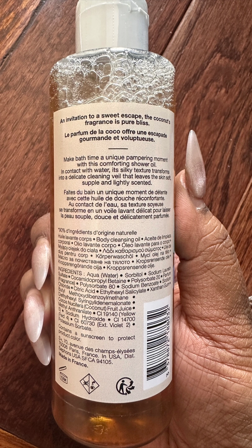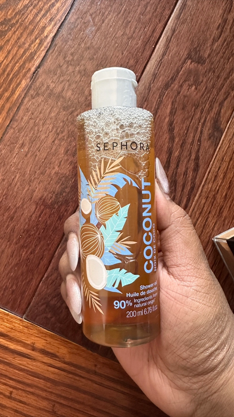 Selling a bottle of Sephora Coconut shower oil. It's a body cleansing oil made with 90% natural origin ingredients. The texture transforms with water into a delicate cleansing veil that leaves the skin soft, supple and lightly scented. The bottle contains 200ml (6.76 fl oz) New, sealed