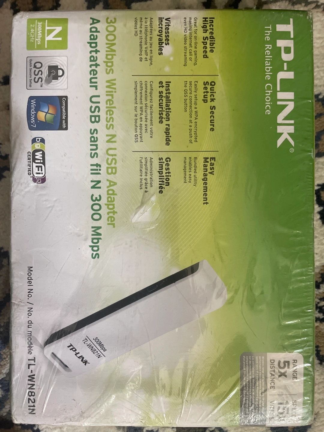 Selling a brand new TP-Link TL-WN821N 300Mbps Wireless N USB Adapter. It's compatible with Windows 7 and offers quick secure setup with easy management. The adapter provides a stable wireless connection for online gaming or video streaming. Includes easy installation guide