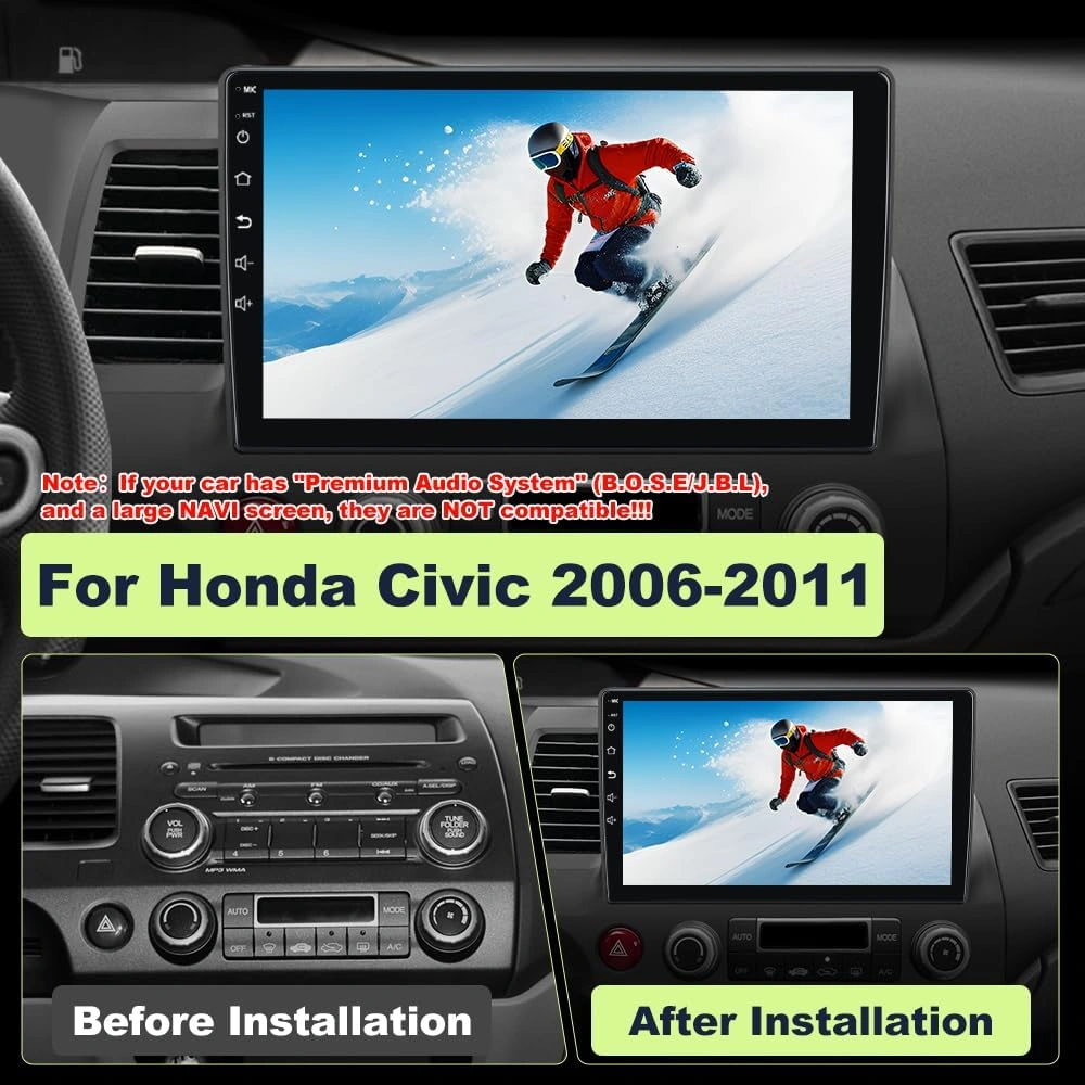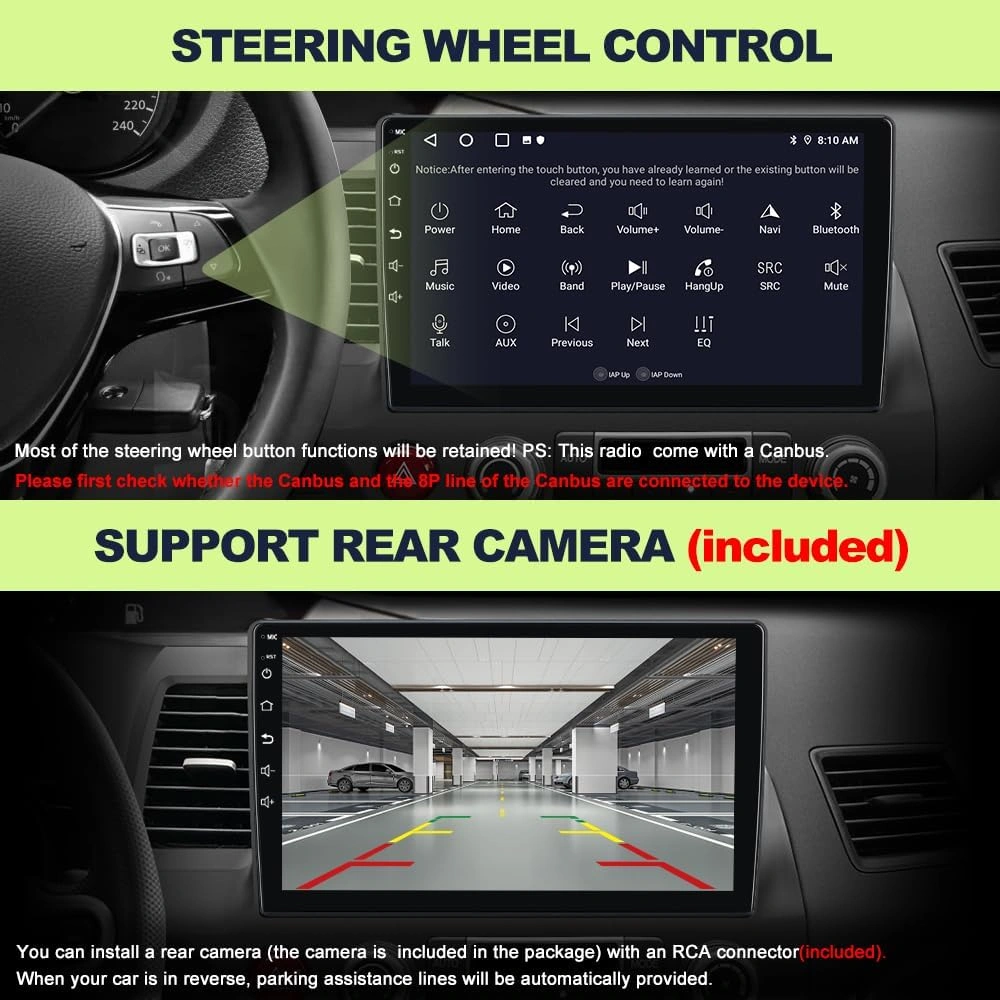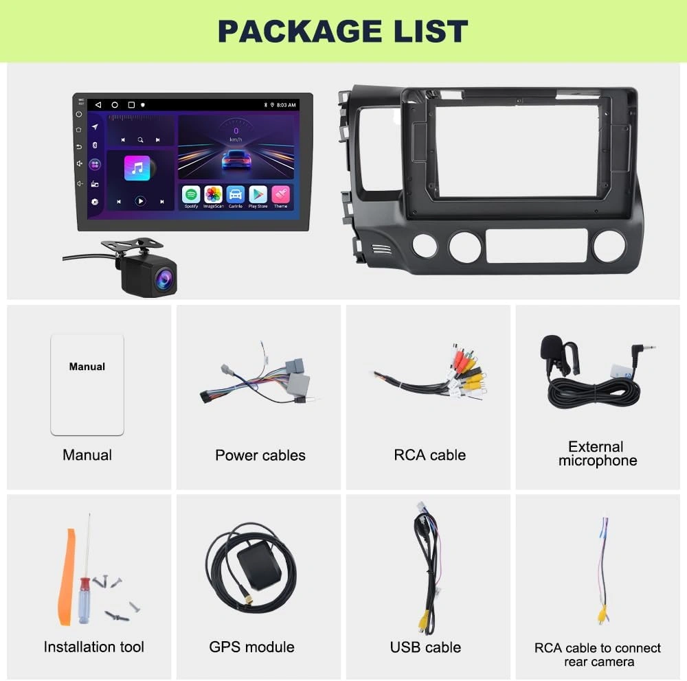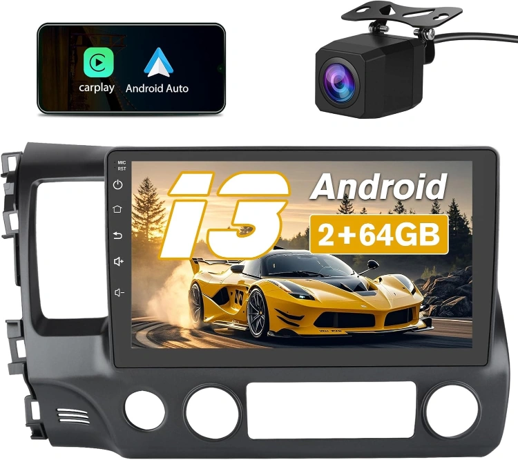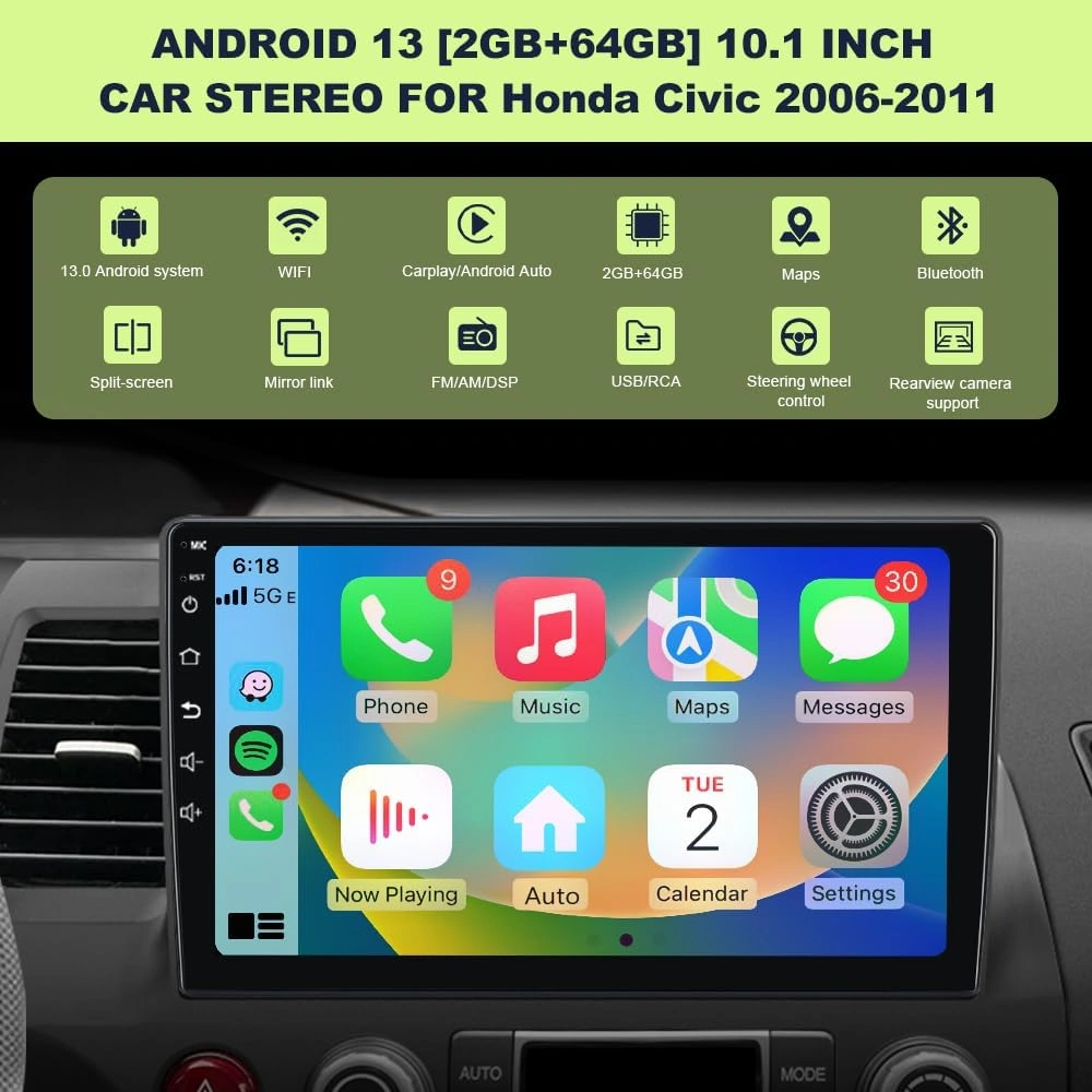 Pyniro Android 13 2+64GB Car Radio Stereo for Honda Civic 2006-2011 10 Inch Head Unit Touchscreen with Wireless CarPlay Android Auto Bluetooth GPS Navigation with Rear Camera, Brand New in the Box/Sealed Features: Android 13 Touchscreen for Honda CIVIC 2006-2011 : Equipped with the latest Android 13 operating system that guarantees maximum security, customization, and compatibility with over 3 million apps on Google Play. The combination of 2GBand 64GB allows you to run multiple apps simultaneously without lag. Bluetooth + Wi-Fi: Stream music via Bluetooth while downloading updates via Wi-Fi. Transform your dashboard into a smart entertainment center! ✅Support for CarPlay/Android Auto Wireless/MirrorLink: You can activate iOS CarPlay or Android Auto via a wired or wireless connection. With built-in voice recognition like Siri or Google Assistant, you can control navigation apps, music, messages, and calls directly from the screen without touching the device. ✅Online GPS Navigation: Includes an external GPS antenna (mount it outside the glove compartment for optimal signal). Allows you to use online navigation apps via Wi-Fi, CarPlay, or Android Auto. ✅Reverse Assist: Connect an AHD720P/CVBS rear camera (included) via the RCA port. When reversing, guidance lines will be displayed on the screen. Compatible with original reversing radars (modified radars are not supported). ✅Split Screen Mode: A vibrant 10-inch IPS display with split mode: display CarPlay/Android Auto on one side and the rear camera view on the other. HD resolution and 60Hz refresh rate for crystal-clear images while navigating and streaming.