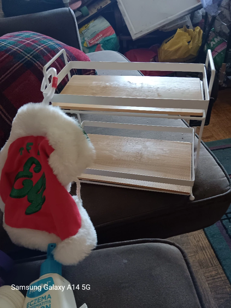 Here's a shelf with a white metal frame and wood shelves. It's in new with tag and ready for a new home! dog cape 647-203-0411