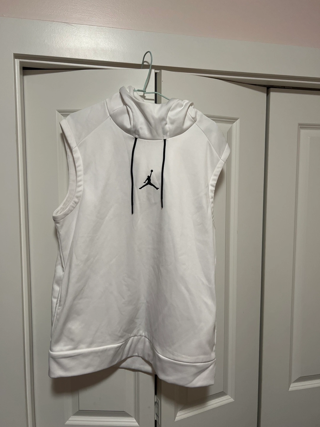 Selling a white Jordan sleeveless hoodie. It features the iconic Jordan logo. Perfect for workouts or casual wear!