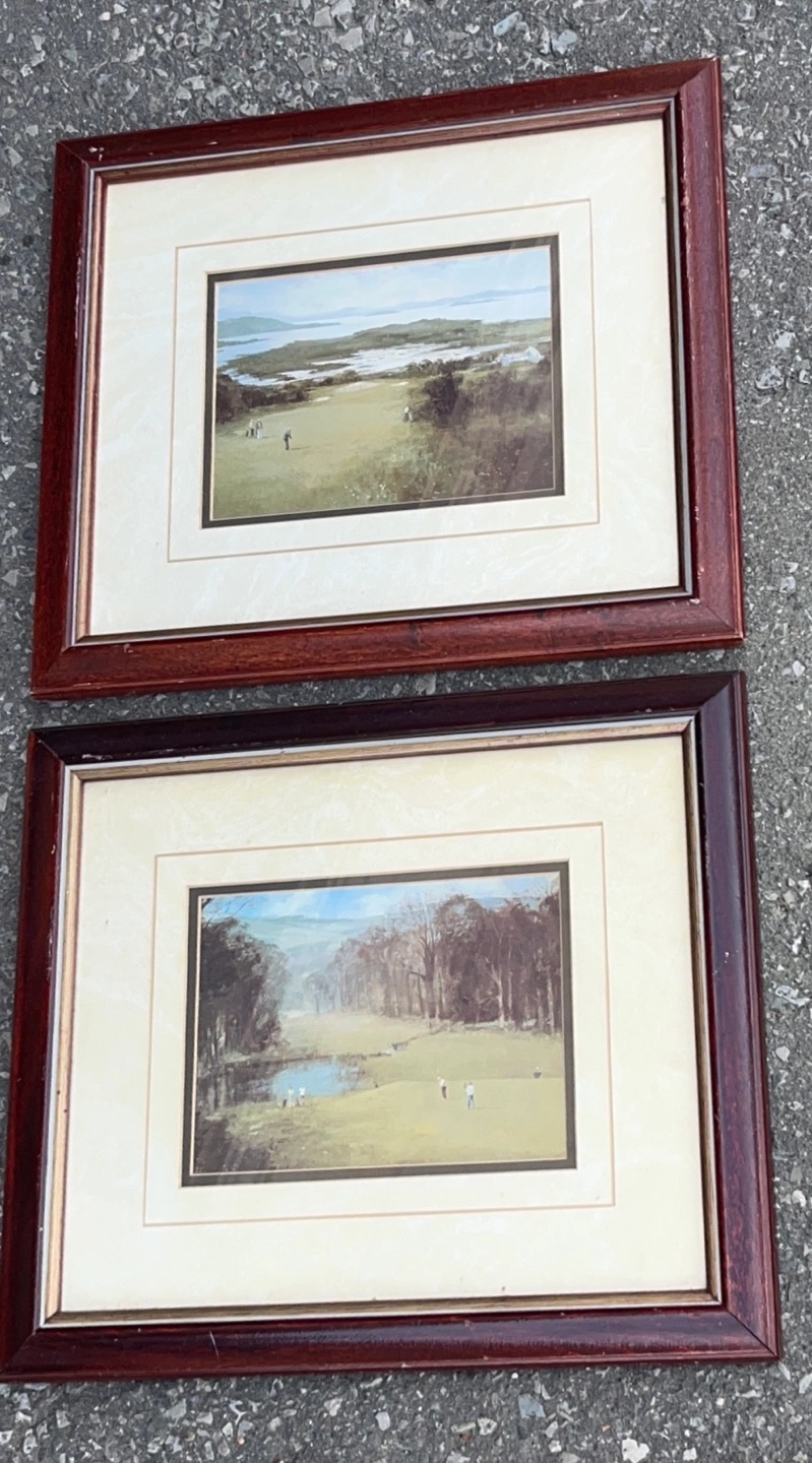 Selling a set of two framed prints featuring golf course scenes. The frames are a dark wood and have some wear and tear. The prints themselves are in good condition and would look great in a den or office. Appr. Size: -frame-14x16 -print-6x8