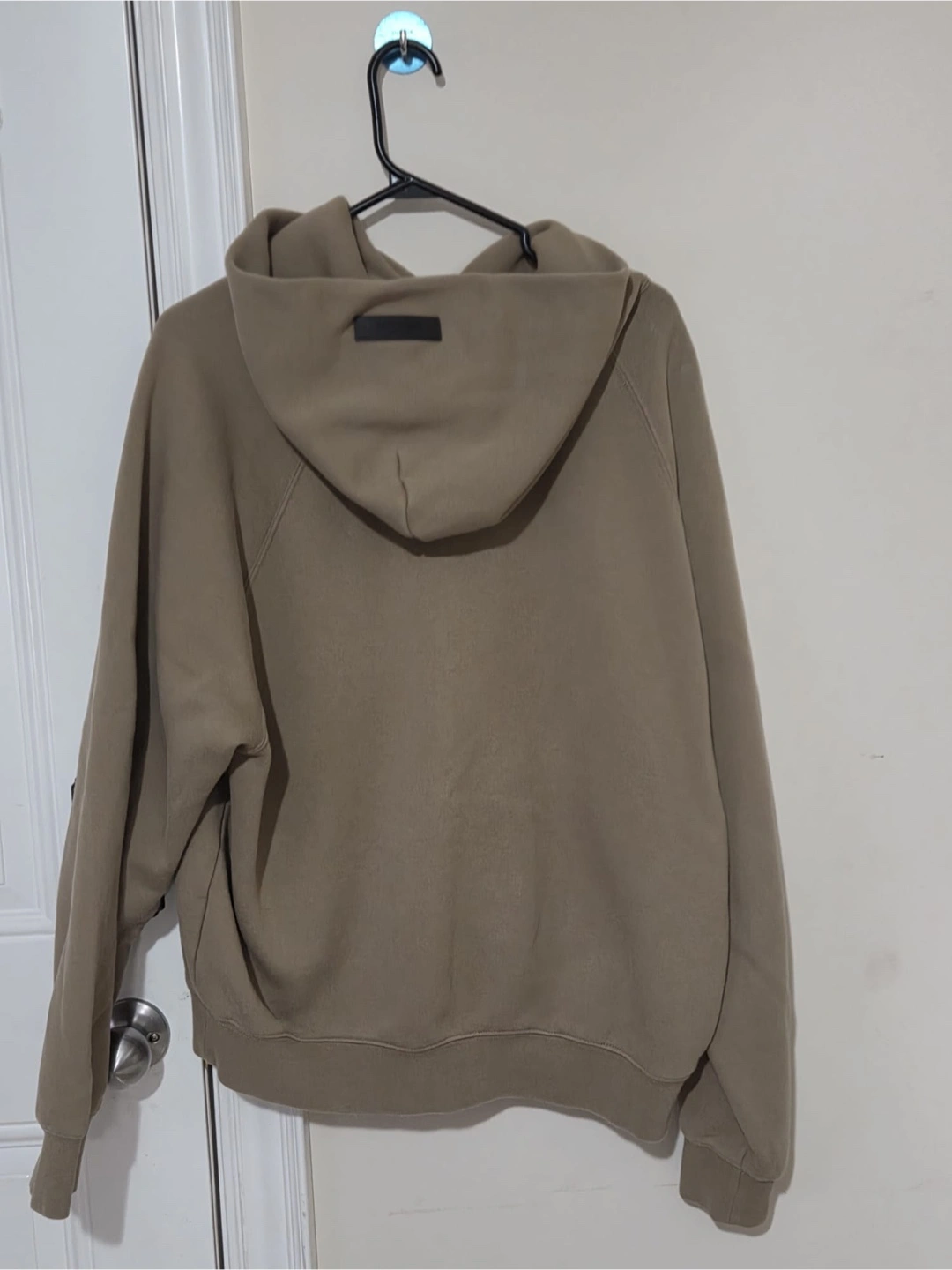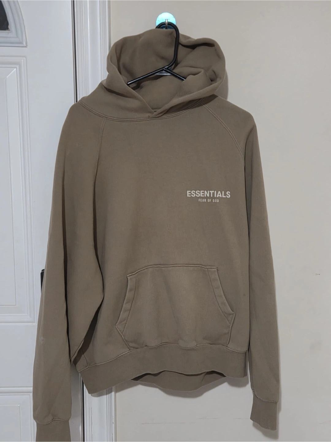 Selling an Essentials Fear of God hoodie in a neutral taupe colour. It features the Essentials logo on the chest and a comfortable, relaxed fit. Perfect for layering or wearing on its own!