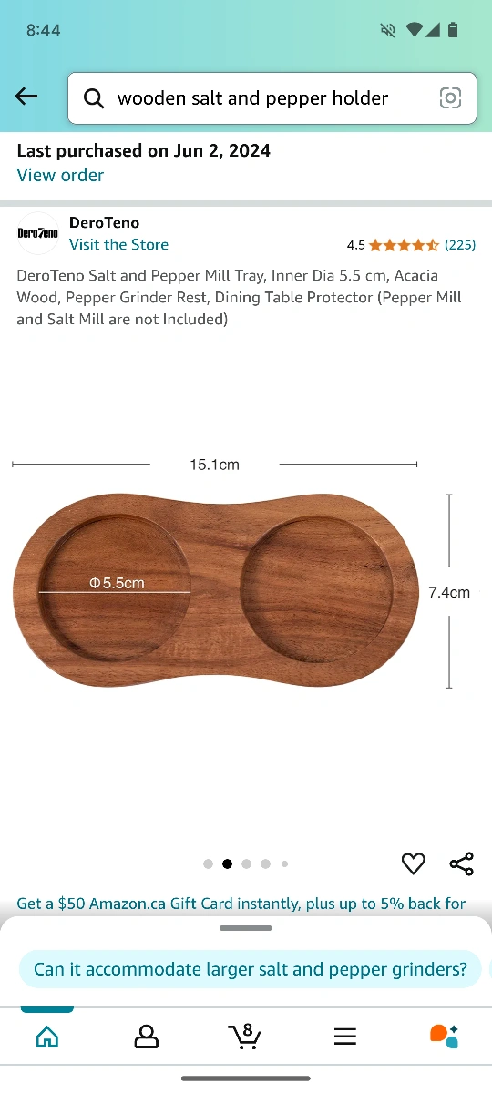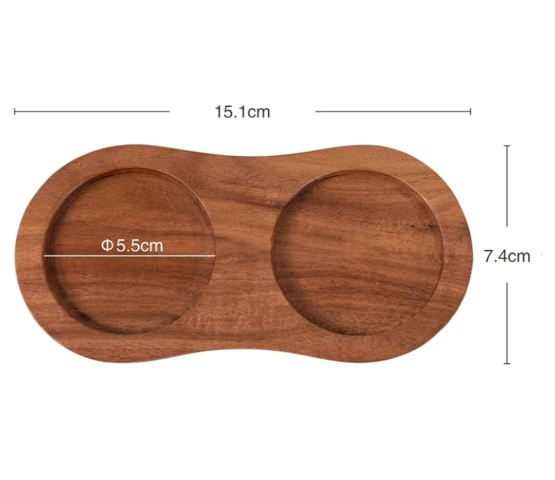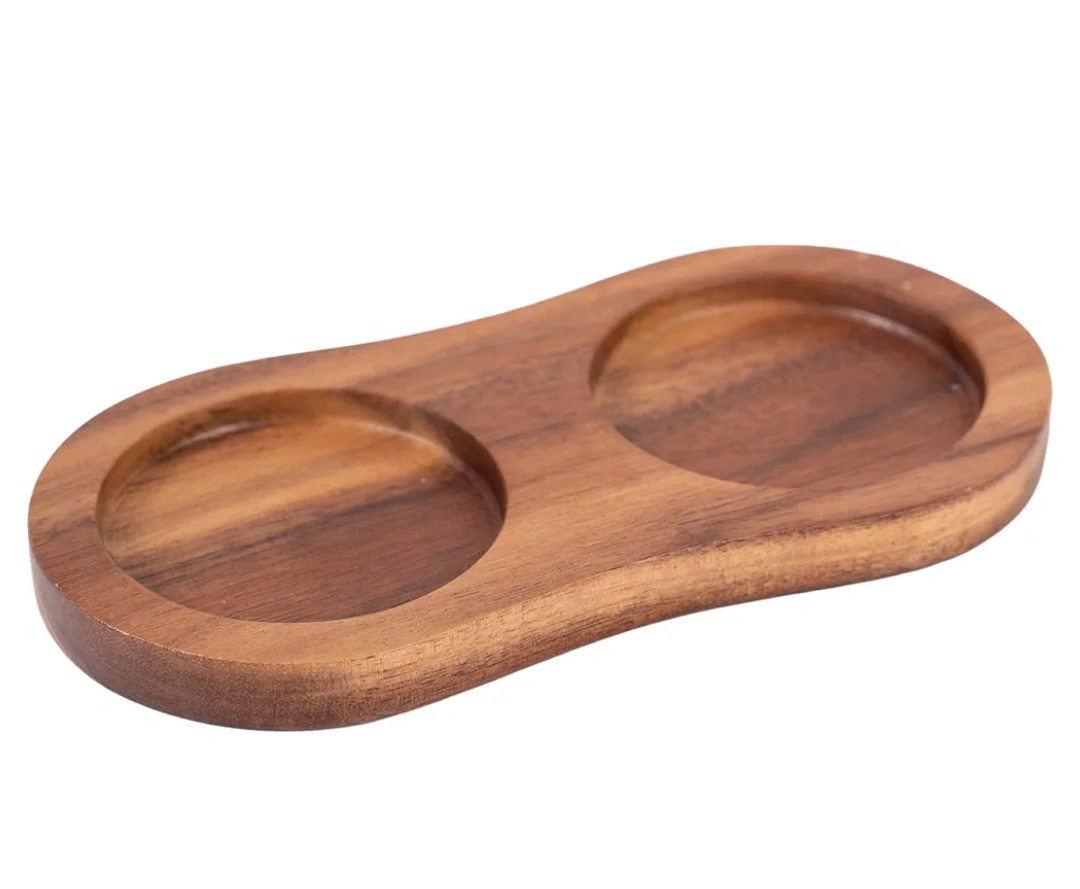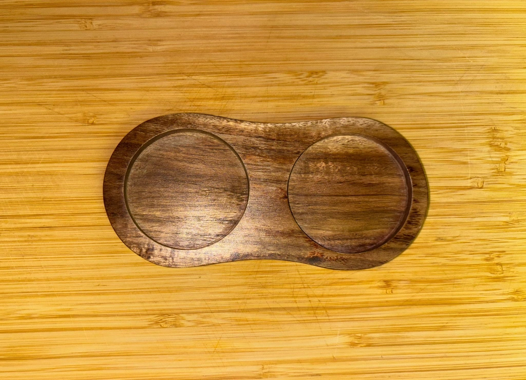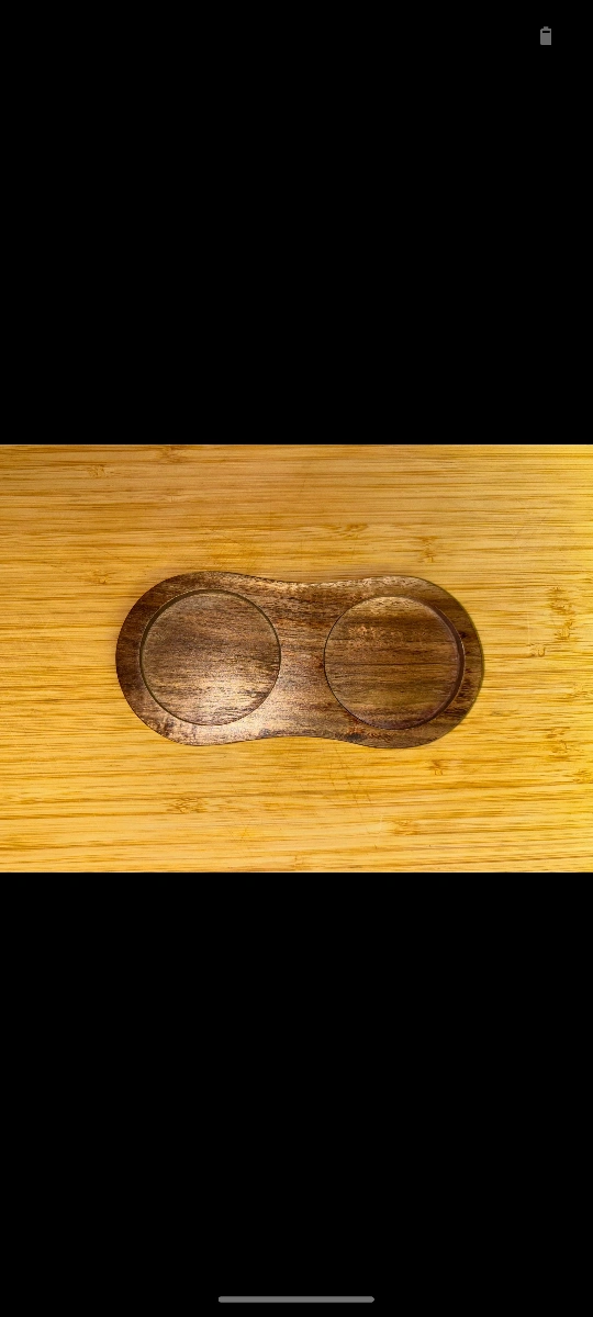 Selling a DeroTeno salt and pepper mill tray. It's made of acacia wood and has two inner circles with a 5.5 cm diameter. The whole tray is 15.1 cm long and 7.4 cm wide. Great for protecting your dining table!