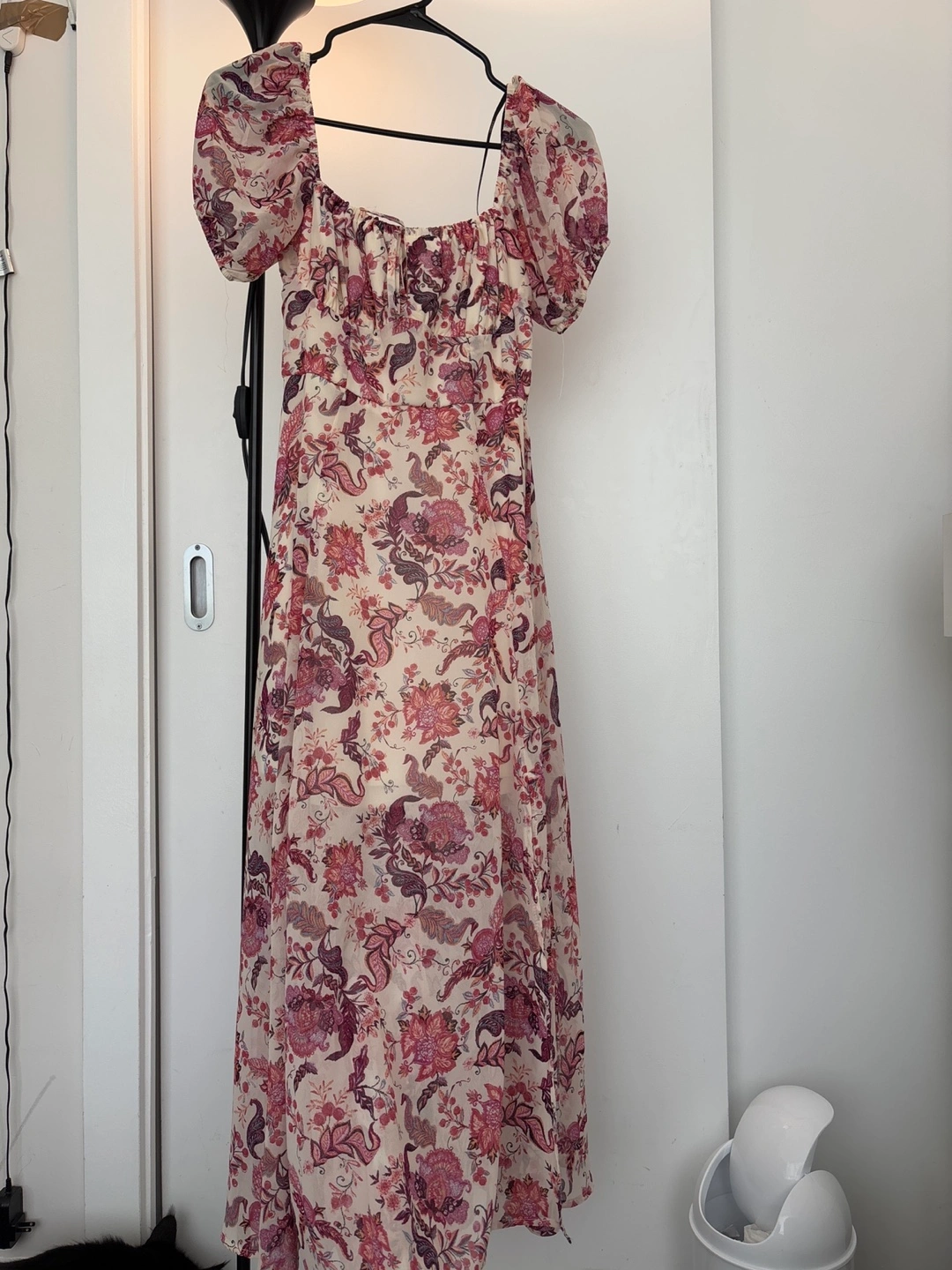 This is a beautiful floral maxi dress! It features a square neckline and short sleeves. The dress has a lovely pattern with shades of pink and purple on a light background. Perfect for a summer day!