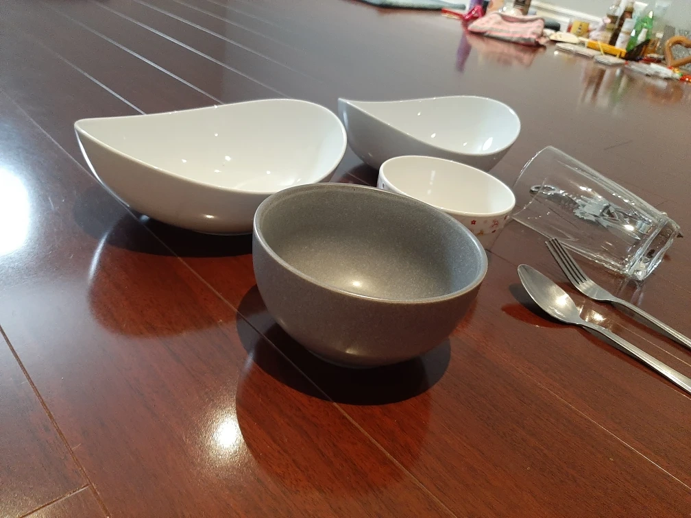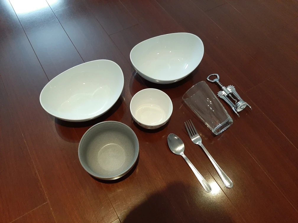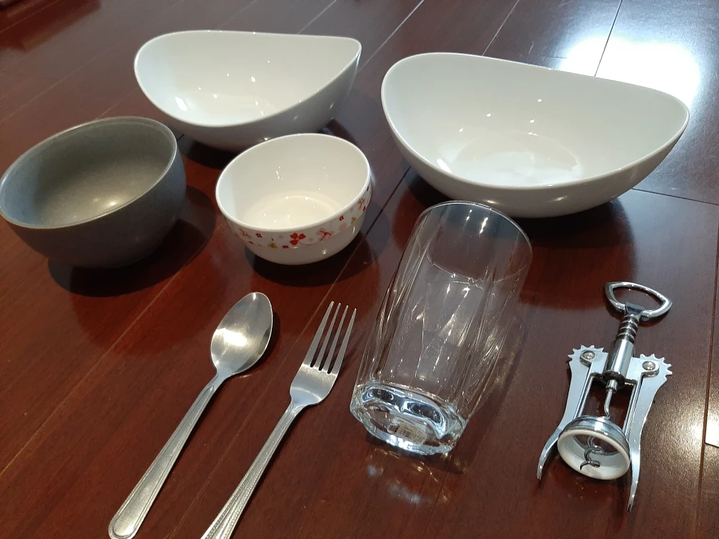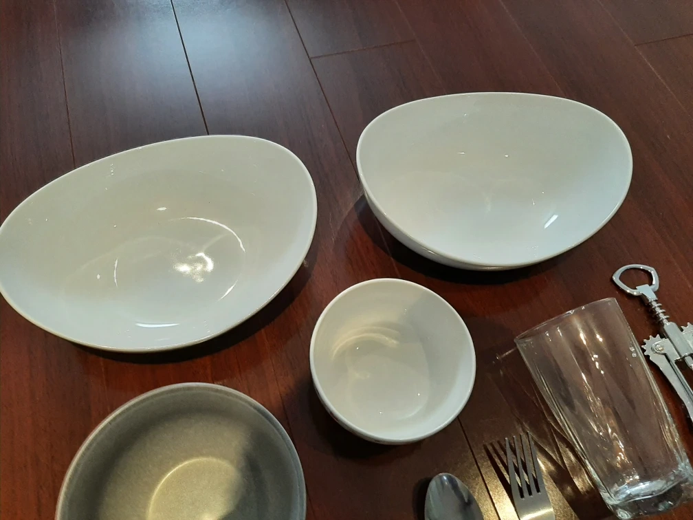 Small bowl - $1 Large gray bowl -$2 Very large white serving bowls - $3 each or 2 for $5. Glass/Cup - $1 Fork/Spoon Set - $1 Corkscrew - $1.50 Pick up Scarborough.