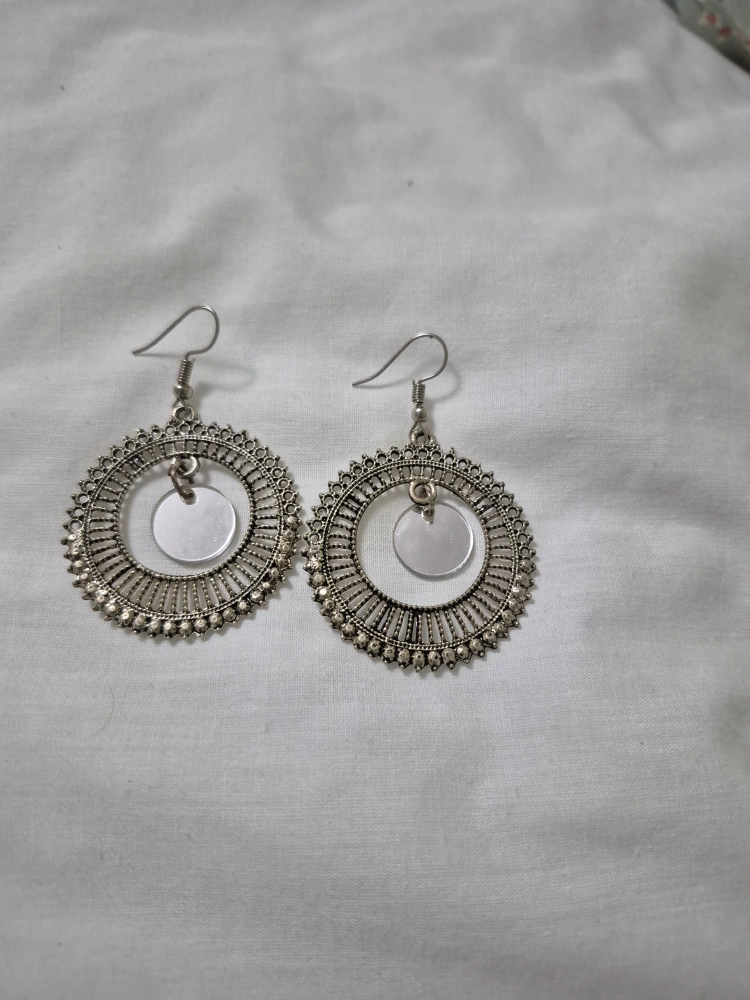 Selling a pair of hoop earrings. They have a unique design with a circular centrepiece. Perfect for adding a bit of flair to any outfit!
