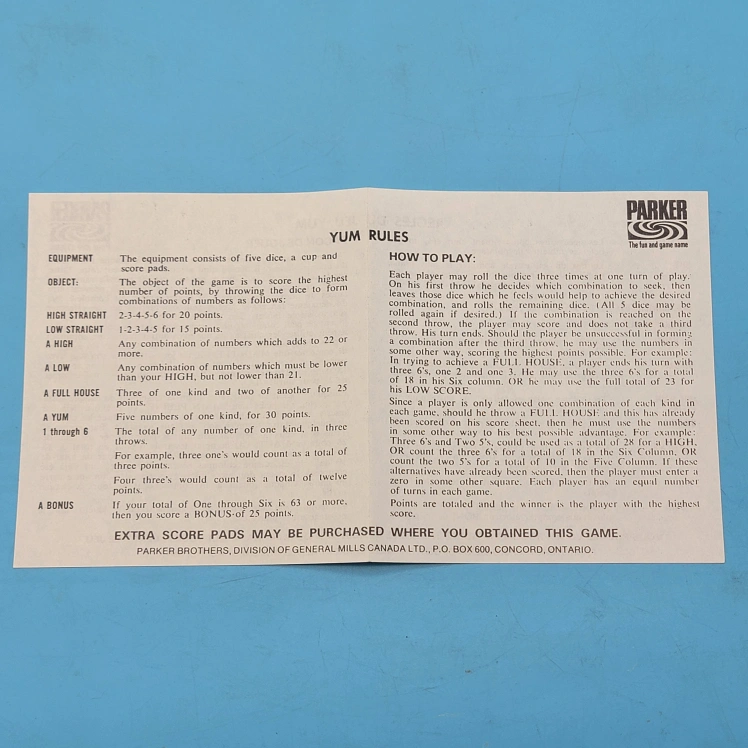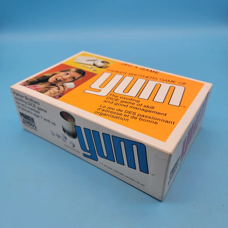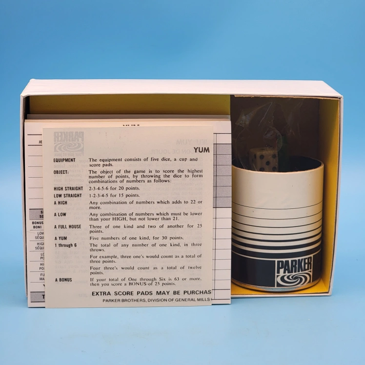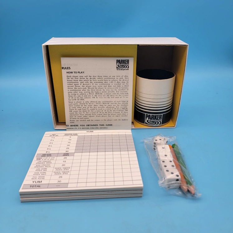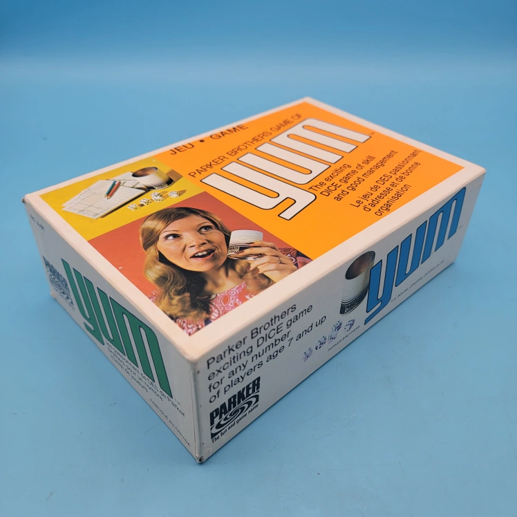 Vintage Parker Brothers YUM dice game! Complete original set. The box includes everything you need for a fun game night: 5 Dice, 1 Cup, 2 Pencils 3 Score pads It's a game of skill and good management, perfect for players age 7 and up. Get ready to roll and score! Please look closely at the attached photos to go along with the description and the condition of the item. Willing to ship at the buyers expense. Please see my many other listings. Thank you for looking. Have a Happy Day! 🙂