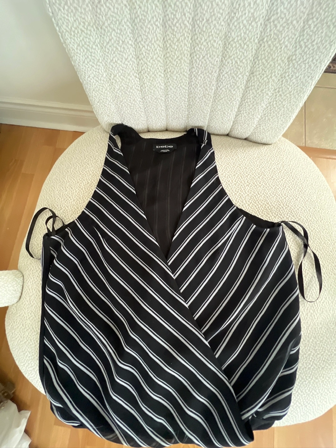Stylish Bebe top featuring a black and white striped pattern! It has a flattering wrap-style front and is perfect for dressing up or down. It's in great condition and ready for a new home