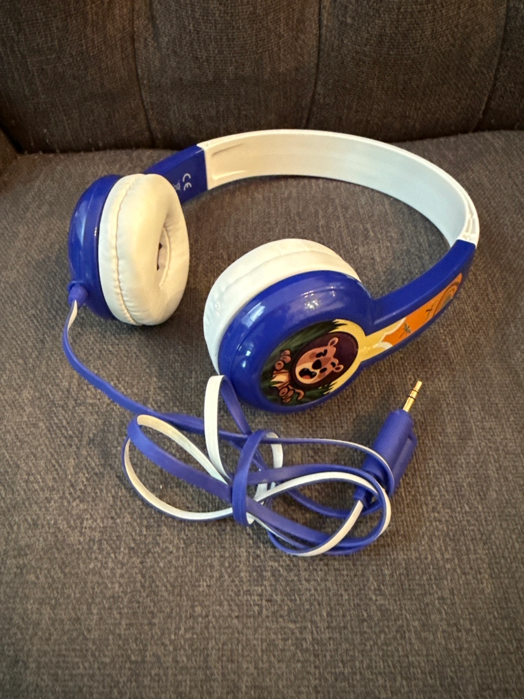 Selling a pair of kids headphones in blue and white. They're in great shape and ready for a new home! Perfect for listening to music or watching videos.