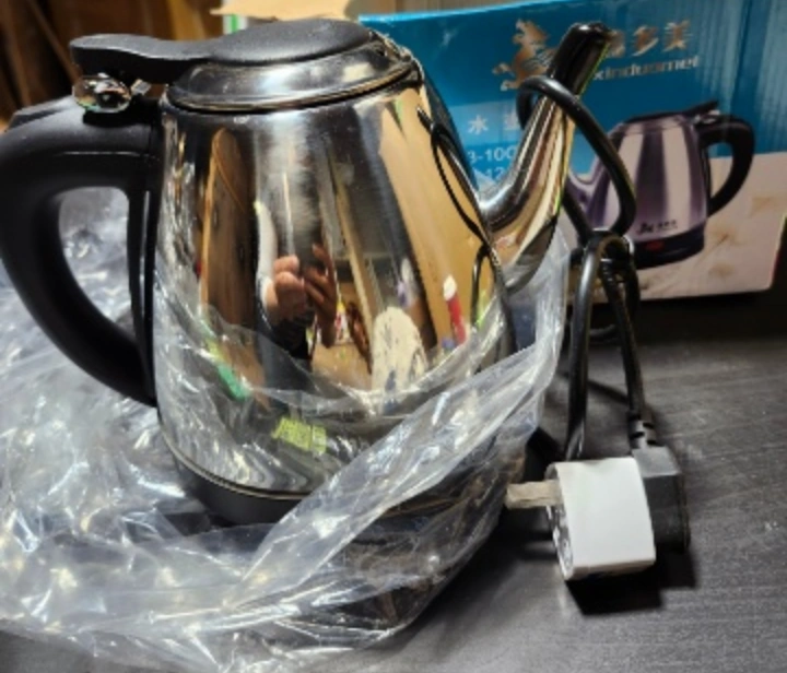 Looking to sell this electric kettle! It's in great condition and ready to boil water for your tea or coffee. It features a stainless steel body with a black handle and base. Perfect for any kitchen! 2L size with plug