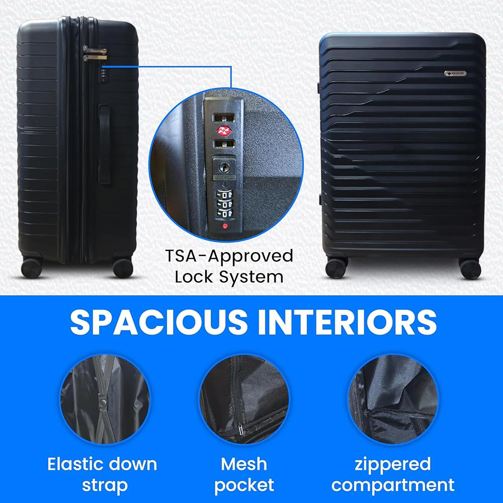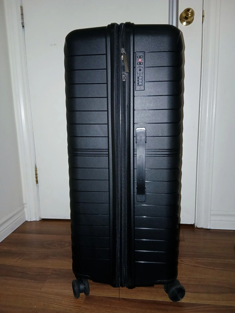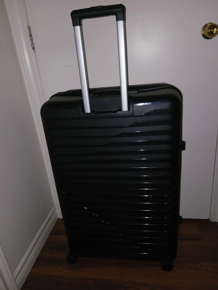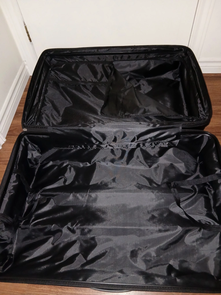 Looking to sell this XL black suitecase. It features a TSA-approved lock system for added security and is lightweight, with 360° spinner wheels. The interior is quite spacious with an elastic down strap, a mesh pocket, and a zippered compartment to keep your belongings organized.