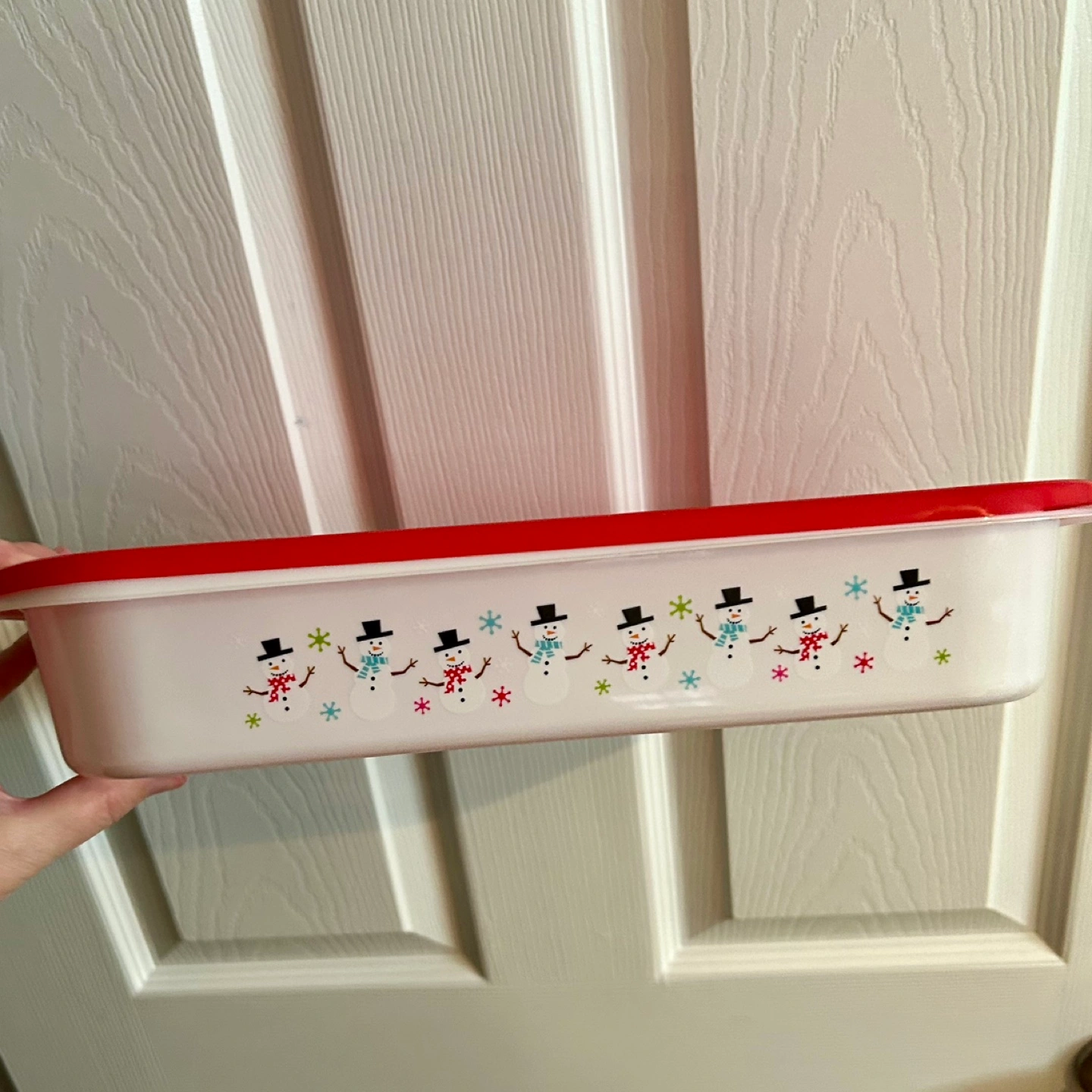Selling a cute Tupperware container with a snowman design! It's perfect for storing holiday treats or leftovers. The container is in great condition.