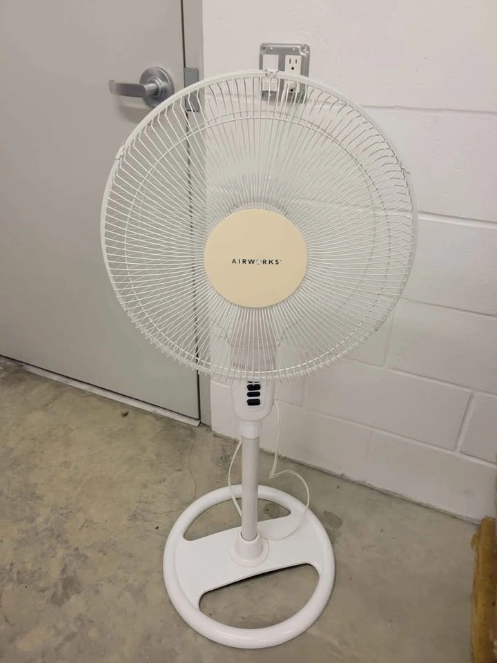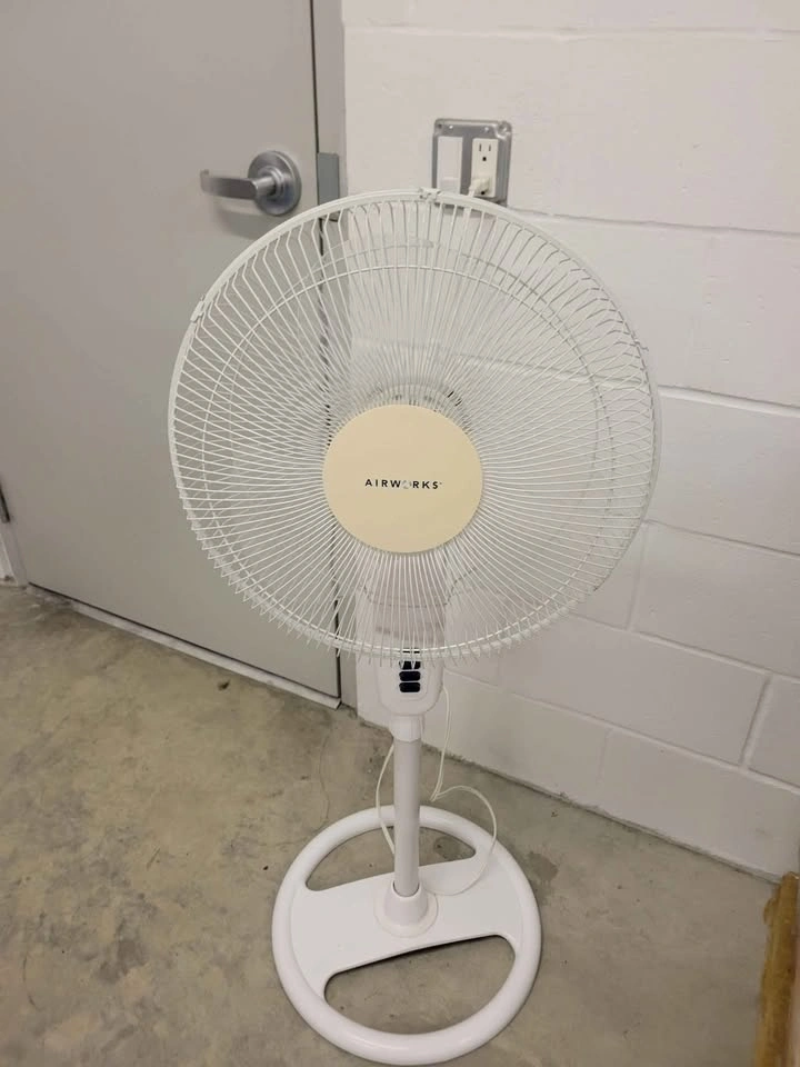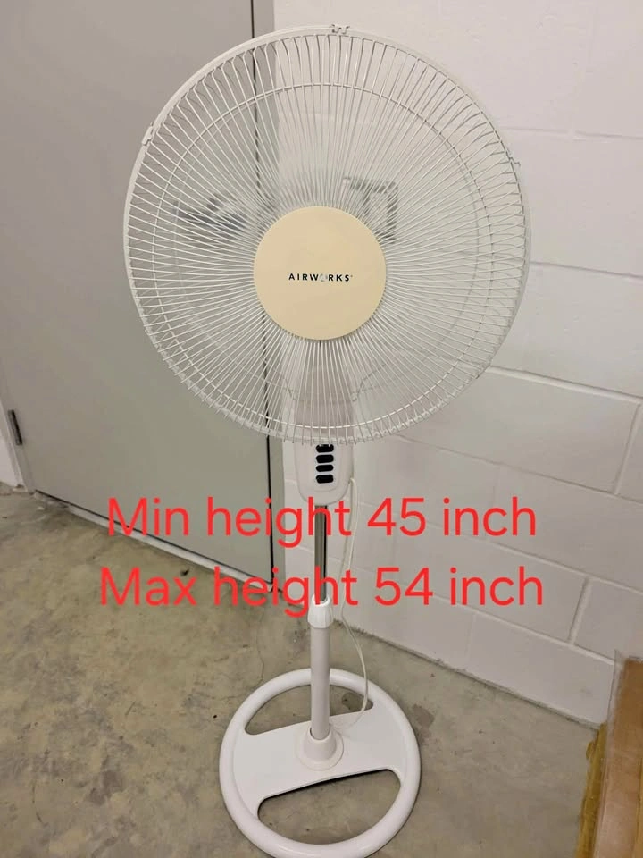 Airworks Pedestal Fan. Brand: Airwork Color: White Min and Max height: 45" & 54" Speeds: 3 speeds. Low/Med/High & Off knob Made in: China