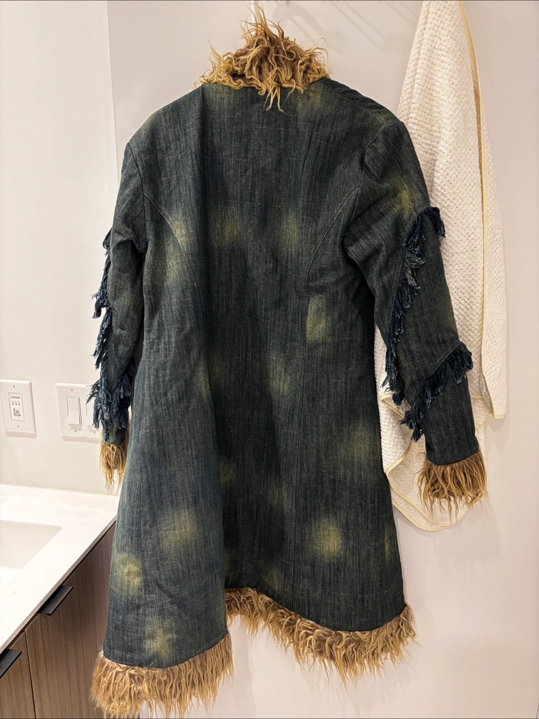 Unique denim coat with faux fur trim! It's in great condition and super stylish. The coat features a distinctive design with faux fur around the collar, cuffs, and hem. Only wore it a few times Pick up in downtown near Eaton