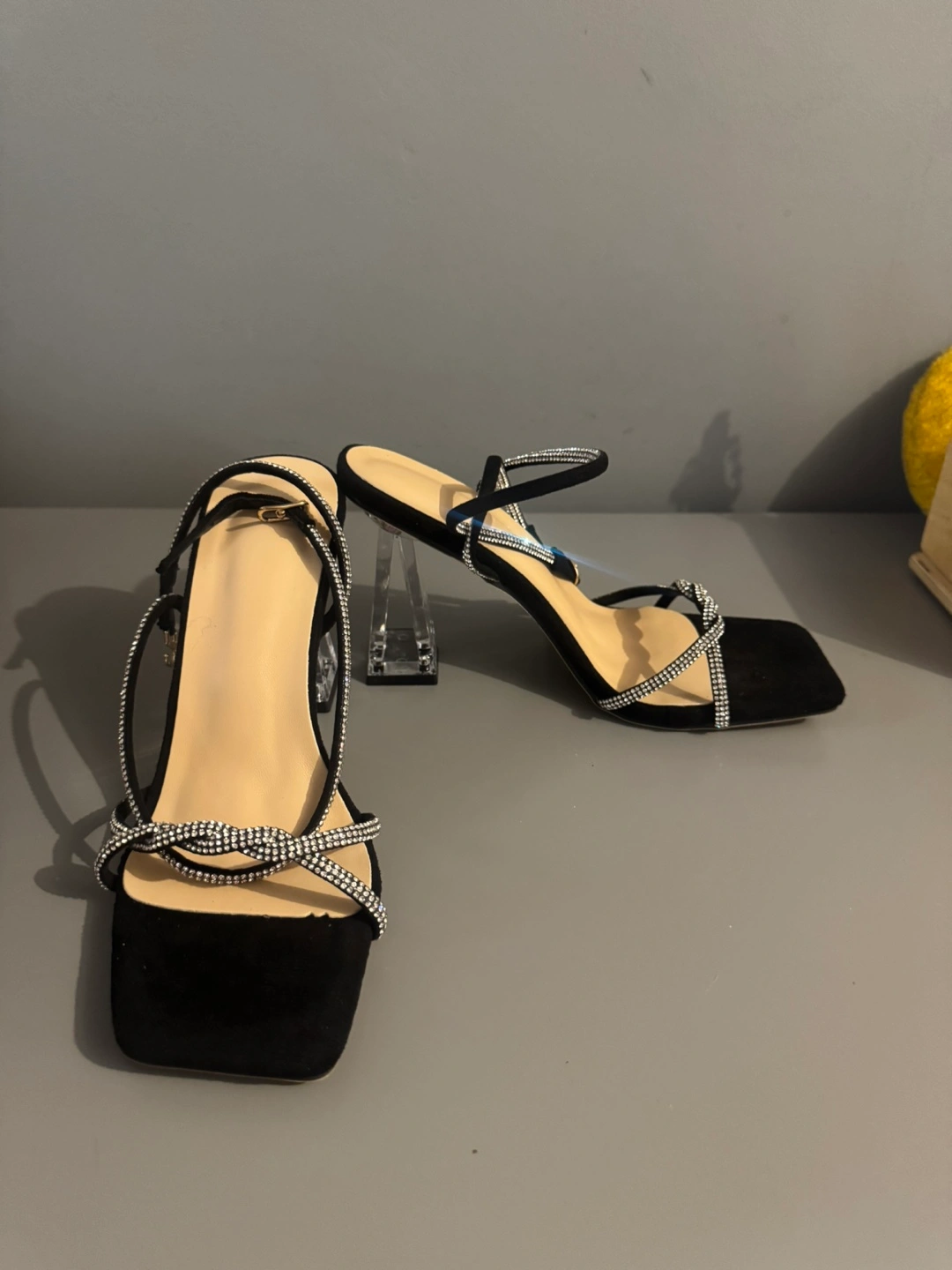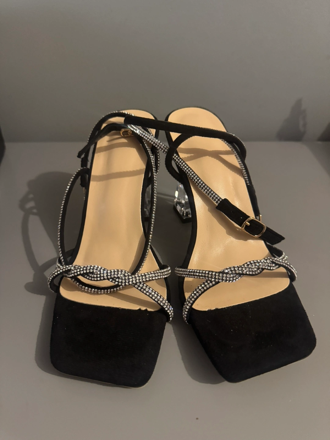 These black heels are in great condition and ready for a new home! They feature a stylish design with clear block heels and delicate rhinestone detailing. The size is CN37, which is approximately a US size 7. Comes with the original box