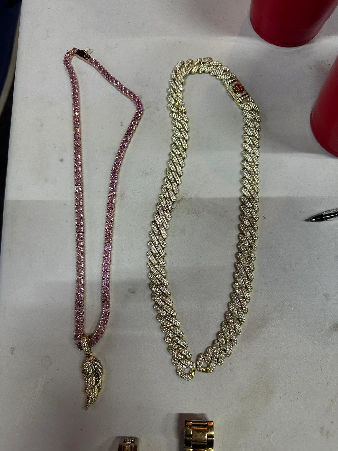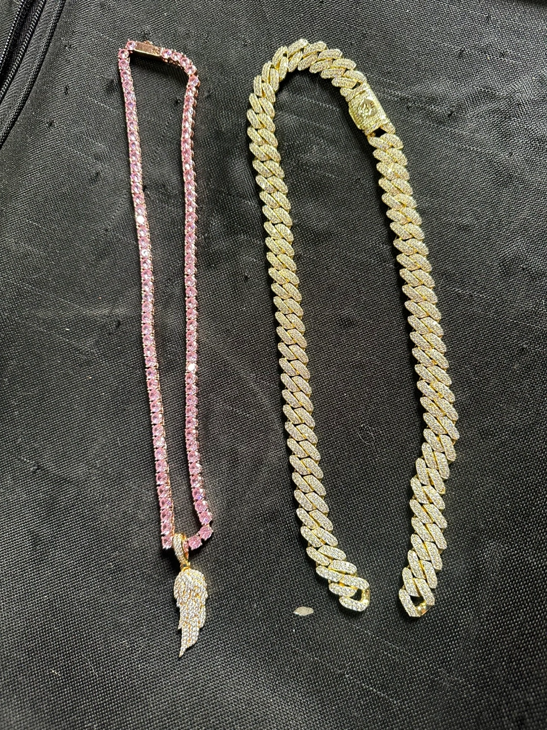 Selling a beautiful set of two necklaces! One is a gold-toned cuban link chain, and the other is a delicate pink tennis chain with an angel wing pendant. Both are in great condition except the gold tone one is the link separated