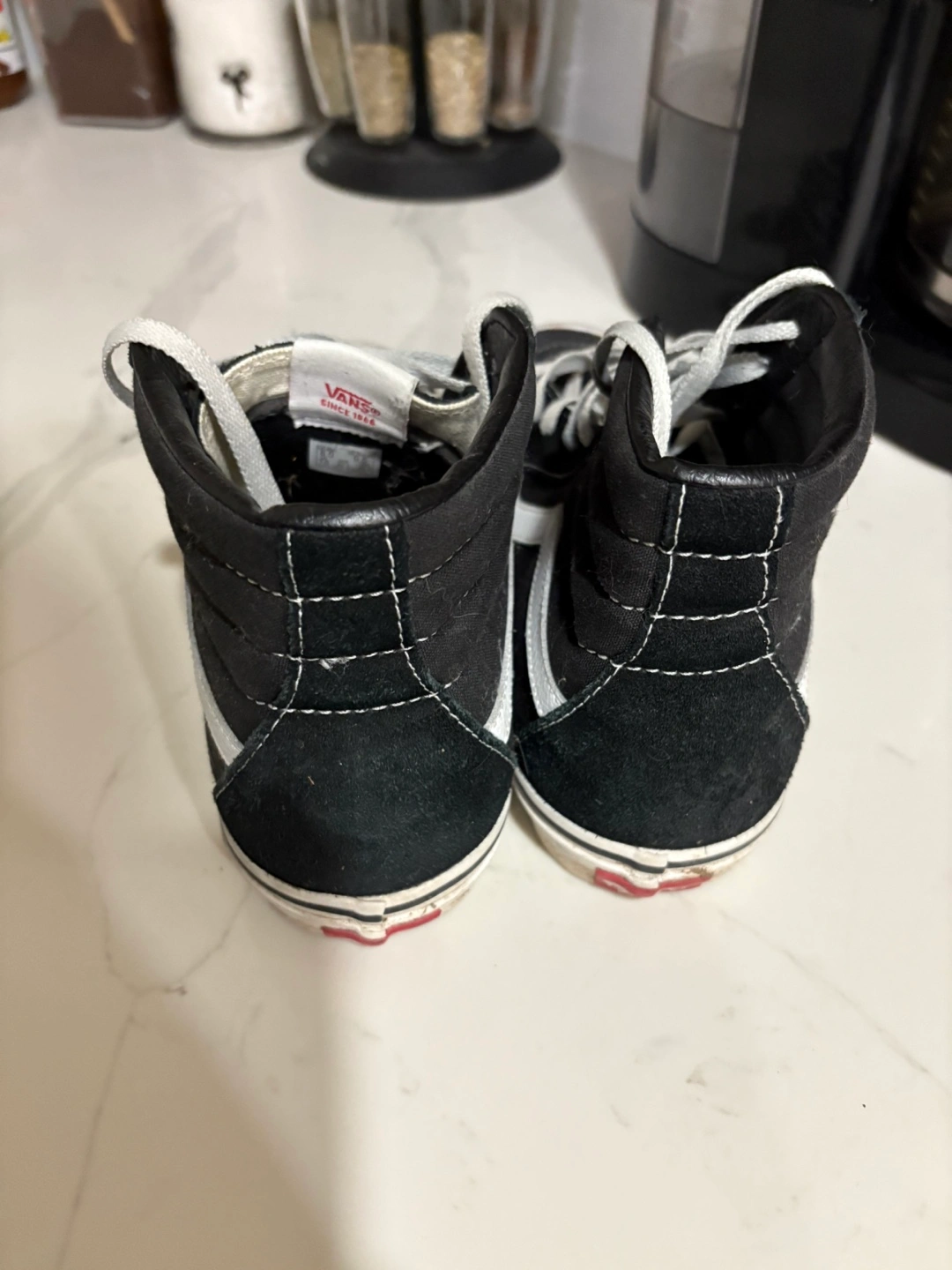 Selling a pair of classic Vans Sk8-Hi sneakers. They're in black and white and have the iconic Vans stripe on the side. These are a timeless style and are in good condition for everyday wear! Easy to clean and very comfy but no longer fit my daughter!