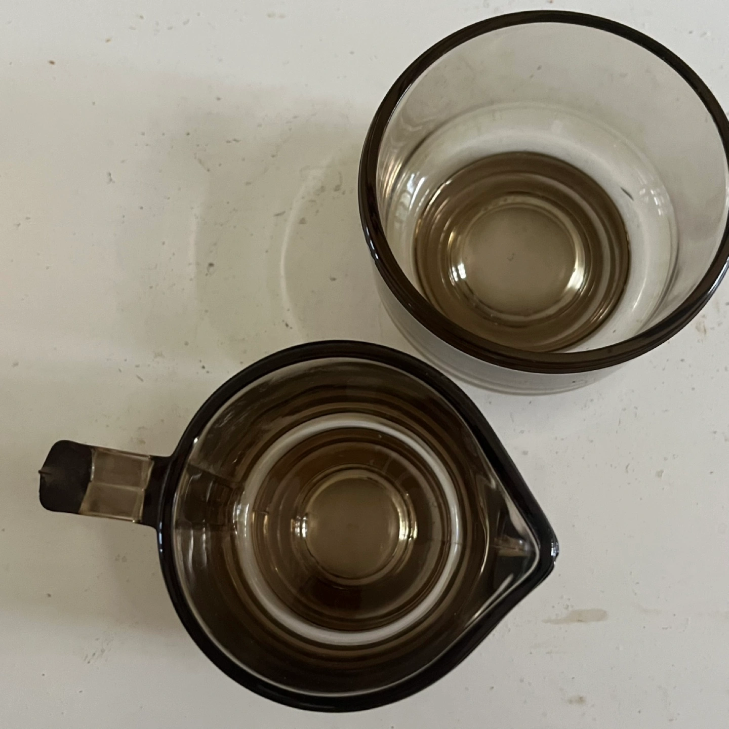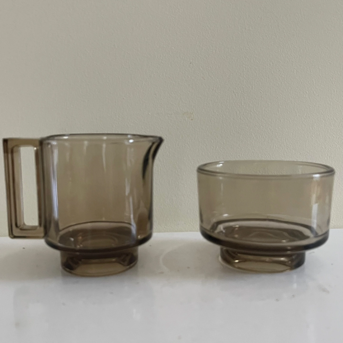 Italian MCM smoky clear glass cream and sugar set. Classic mid-century design with a cubic handle and circular foot. Each piece is stamped ITALY. Good vintage condition. Pick up Montgomery. Cross-posted. Please see my other listings for more vintage treasures.