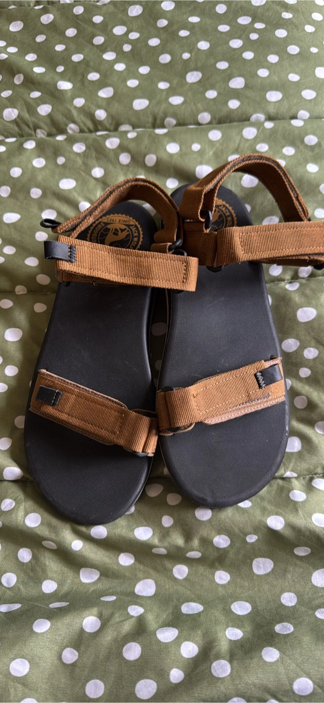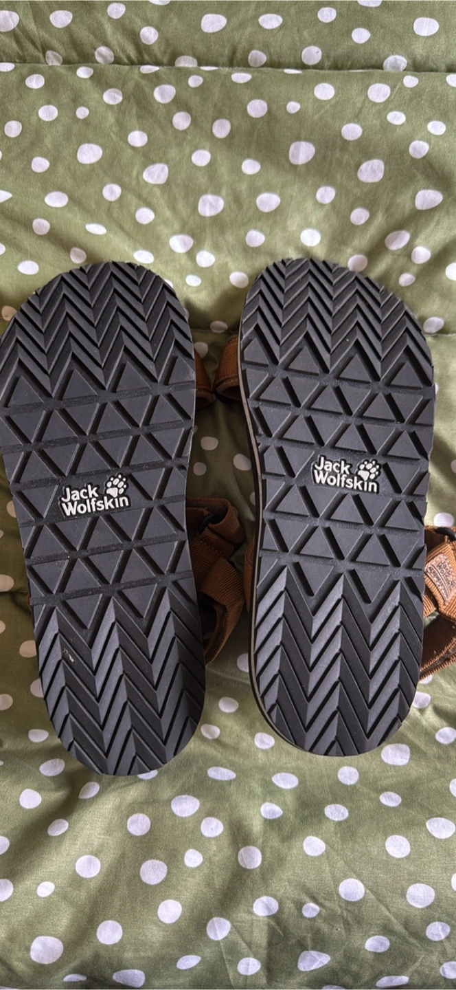 Selling a pair of Jack Wolfskin sandals. They have a black sole and brown straps. The soles have the Jack Wolfskin logo on them. Great for summer!