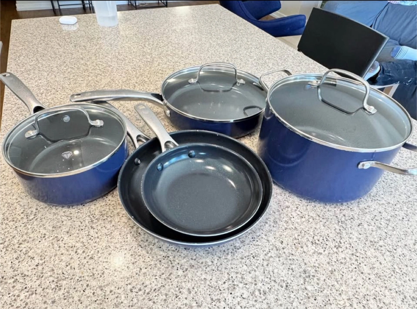 Selling a Blue Diamond cookware set! This set includes a variety of pots and pans, perfect for any kitchen. The set appears to be in good condition and ready for a new home. Great for cooking up your favourite meals!