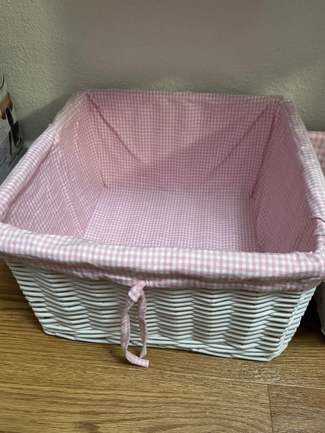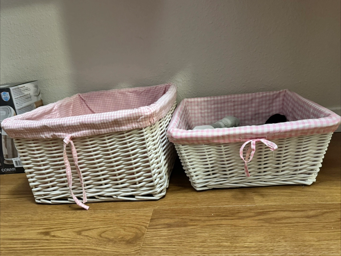 Selling two cute wicker storage baskets! They're white with a pink and white gingham fabric lining. Perfect for organizing toys, linens, or anything else you need to tidy up. They're in great condition and ready for a new home!
