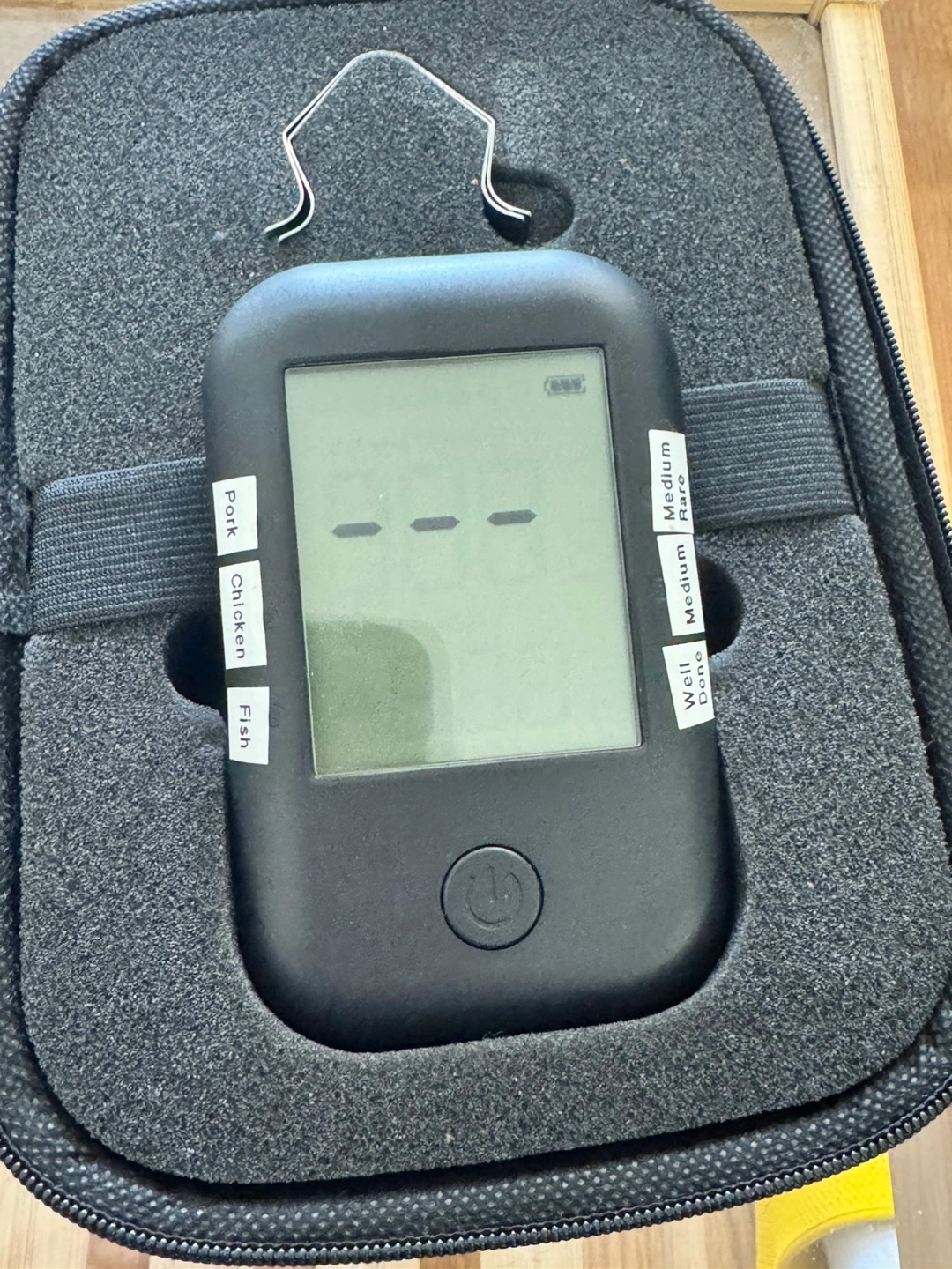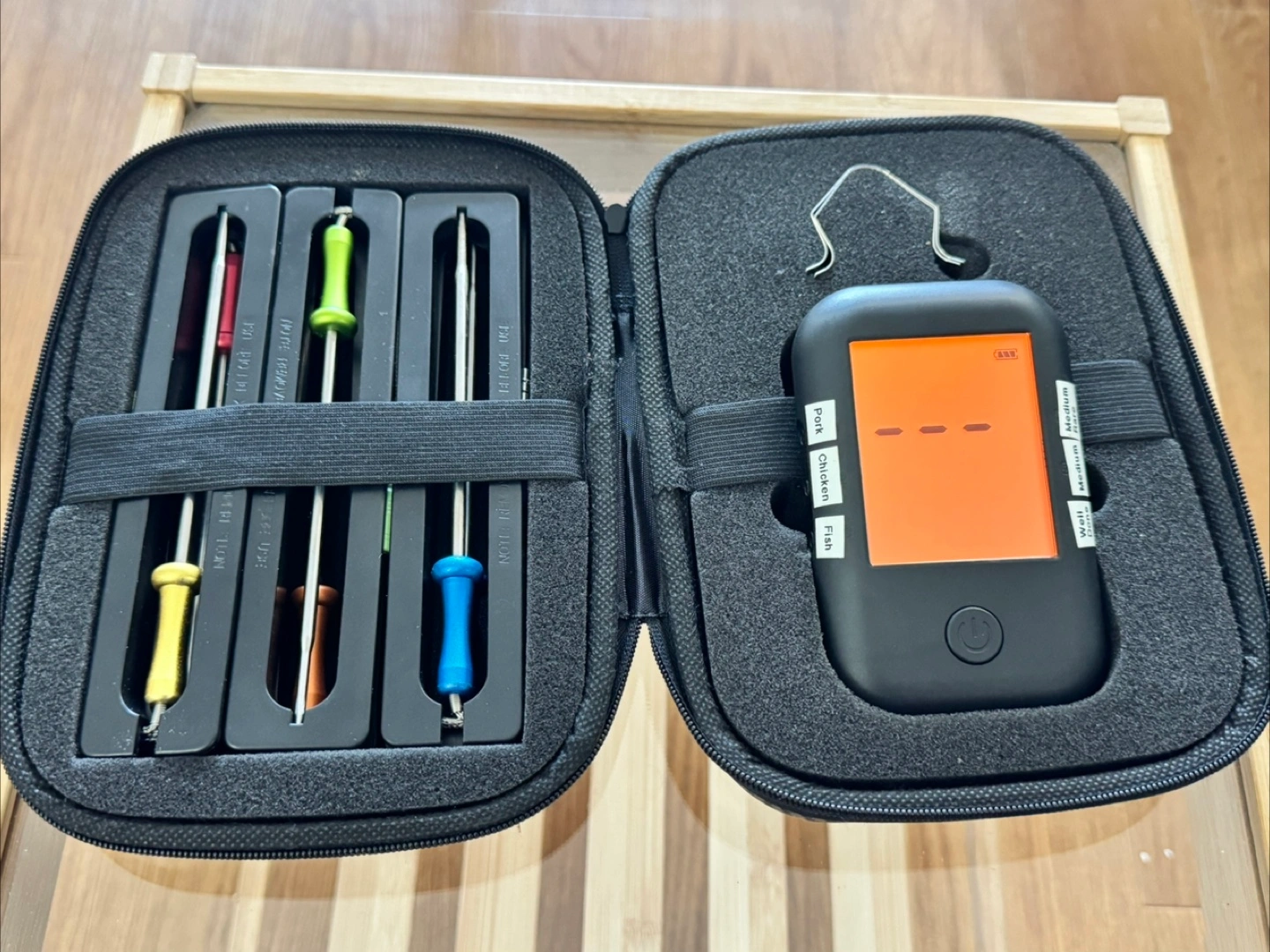 Selling a digital meat thermometer, complete with multiple probes for different types of meat like pork, chicken, and fish! It also has settings for different levels of doneness, from rare to well done. Comes with a handy carrying case to keep everything organized