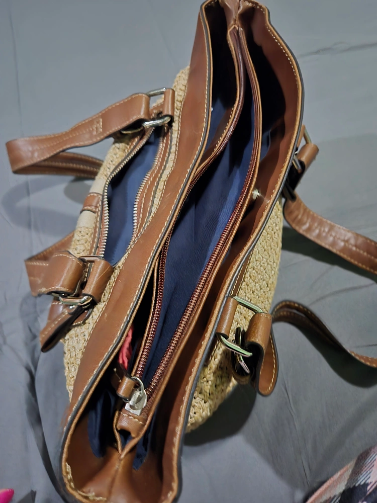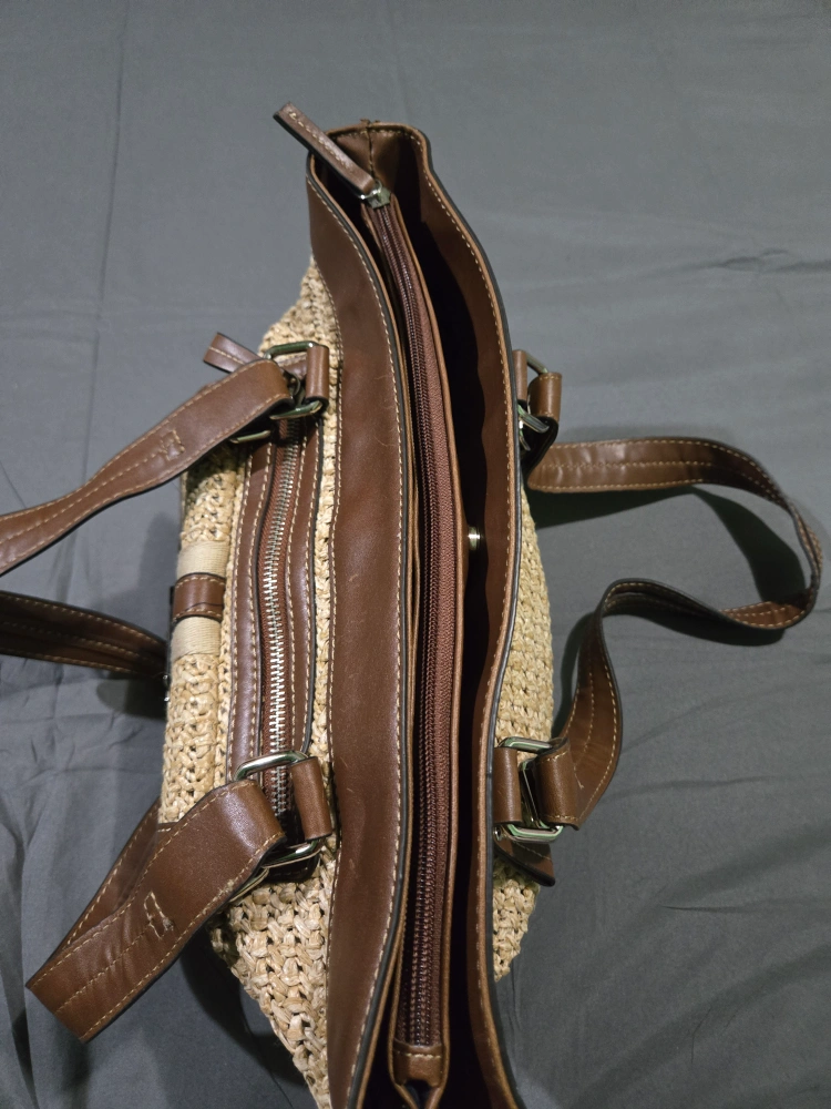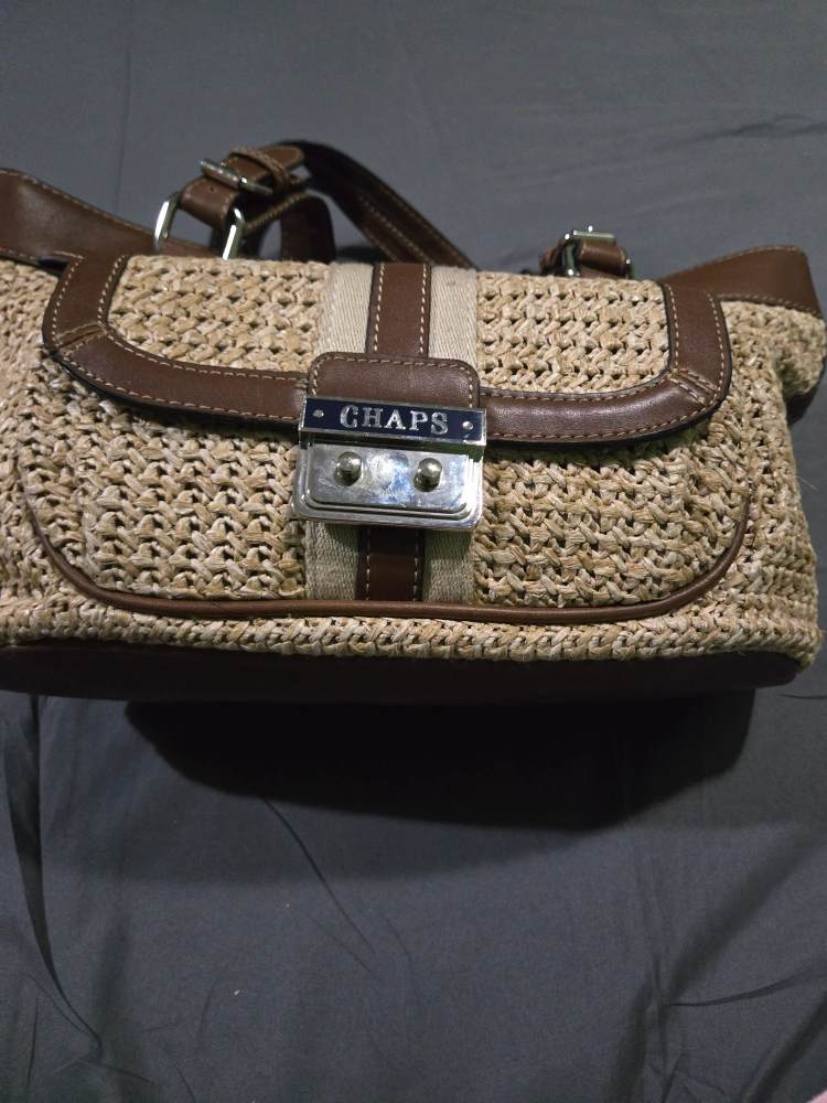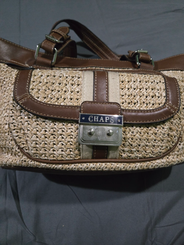 Selling a gently used Chaps handbag! It features a lovely straw body with brown leather trim and handles. The interior has multiple compartments to keep your belongings organized. It's perfect for adding a touch of summery style to your outfit!