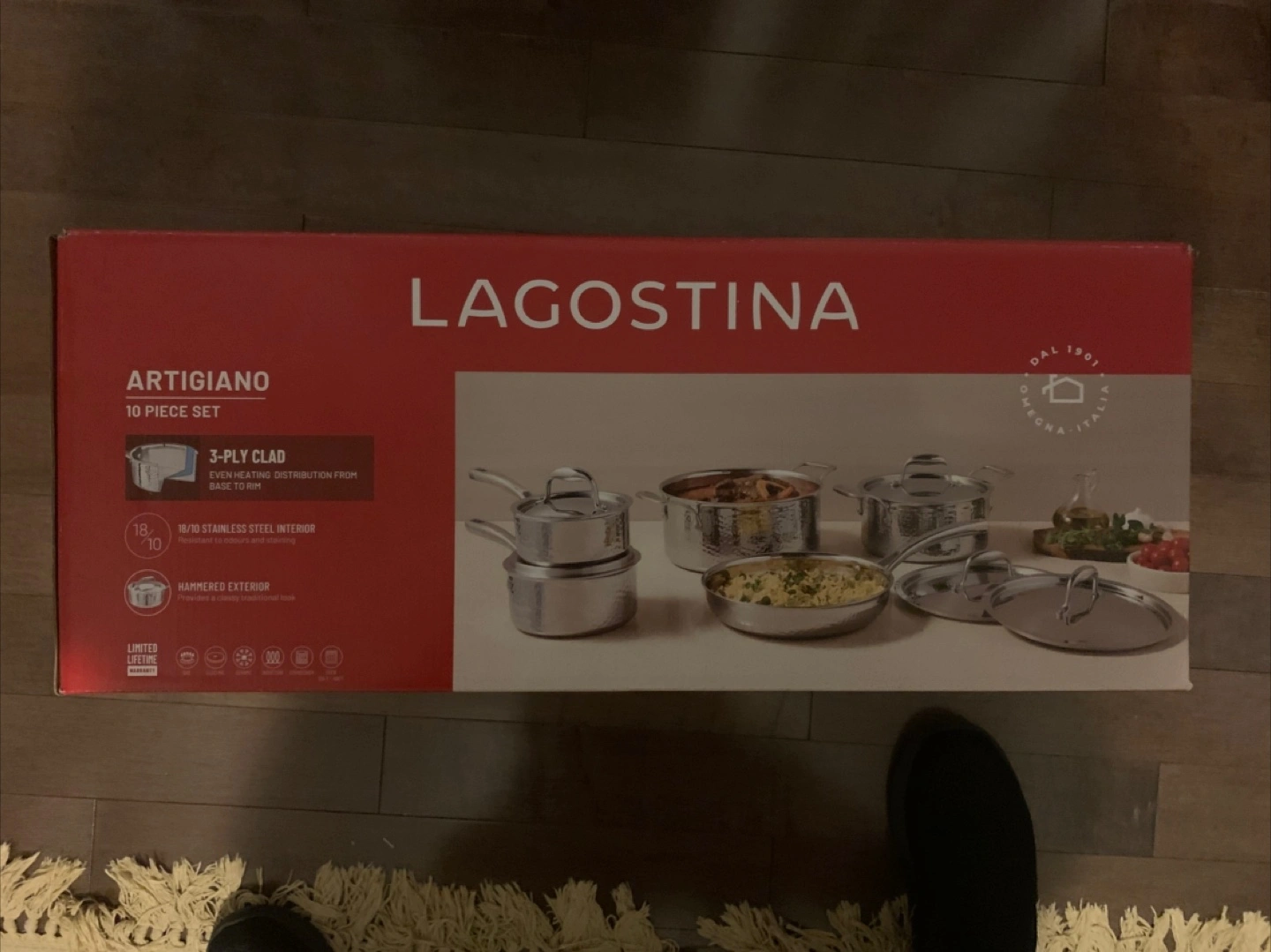 Selling a brand new Lagostina Artigiano 10-piece cookware set! This set features: -Hammered exterior - 3-ply clad construction for even heat distribution - Stainless steel riveted handles for comfort and durability Includes various sizes of saucepans, casseroles, a Dutch oven, and a skillet, all with covers! It's a complete set to upgrade your kitchen. Regular retail price is approx $480 including tax. Cash only