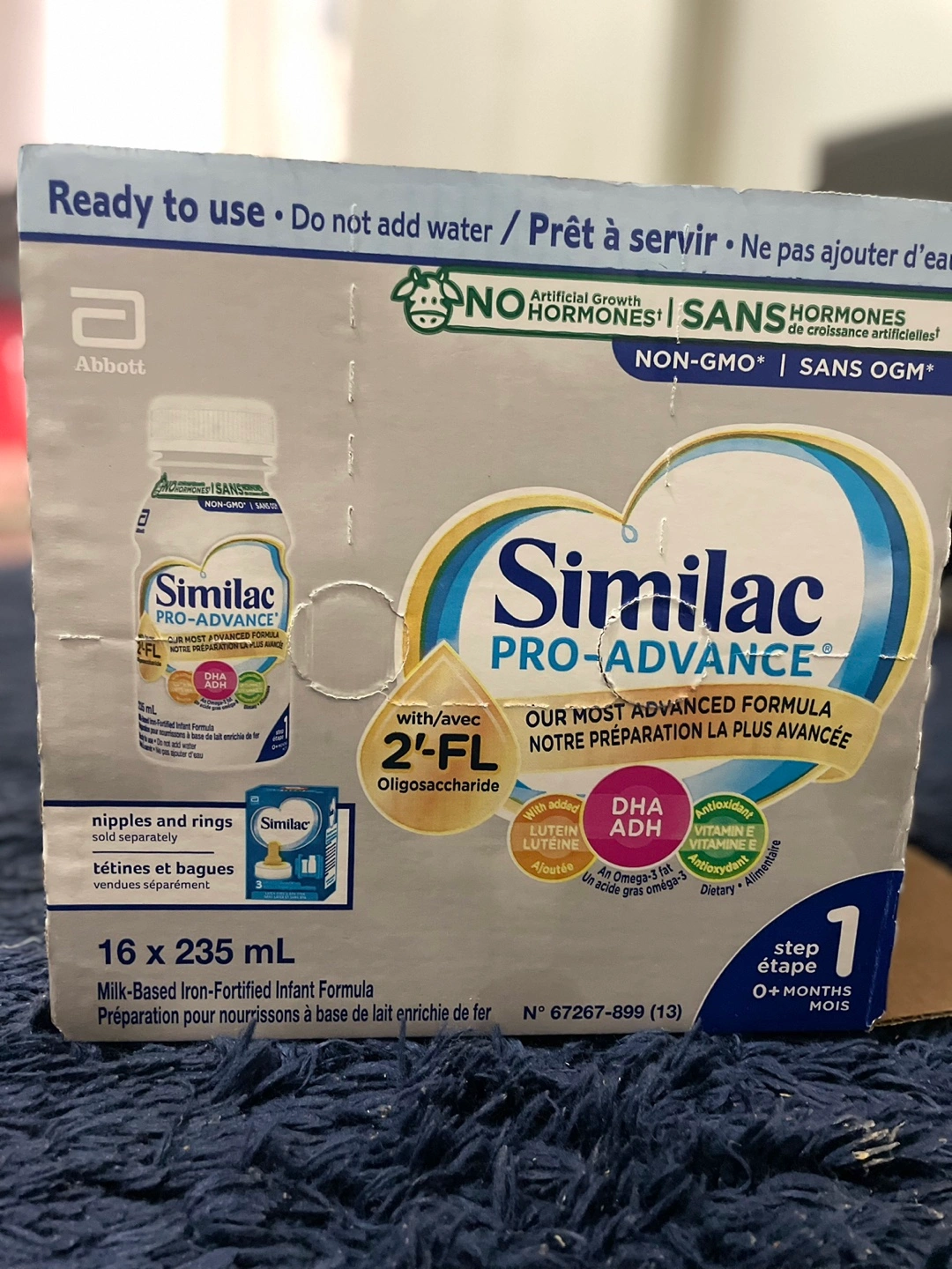 Selling a box of Similac Pro-Advance milk-based iron-fortified infant formula. 8 bottles each 235 ml for little ones aged 0+ months. Ready to use, just shake well before feeding
