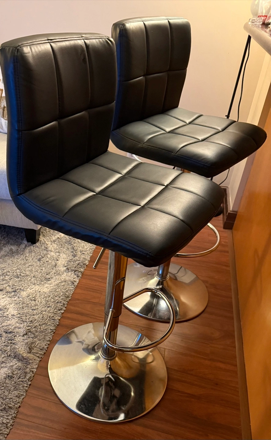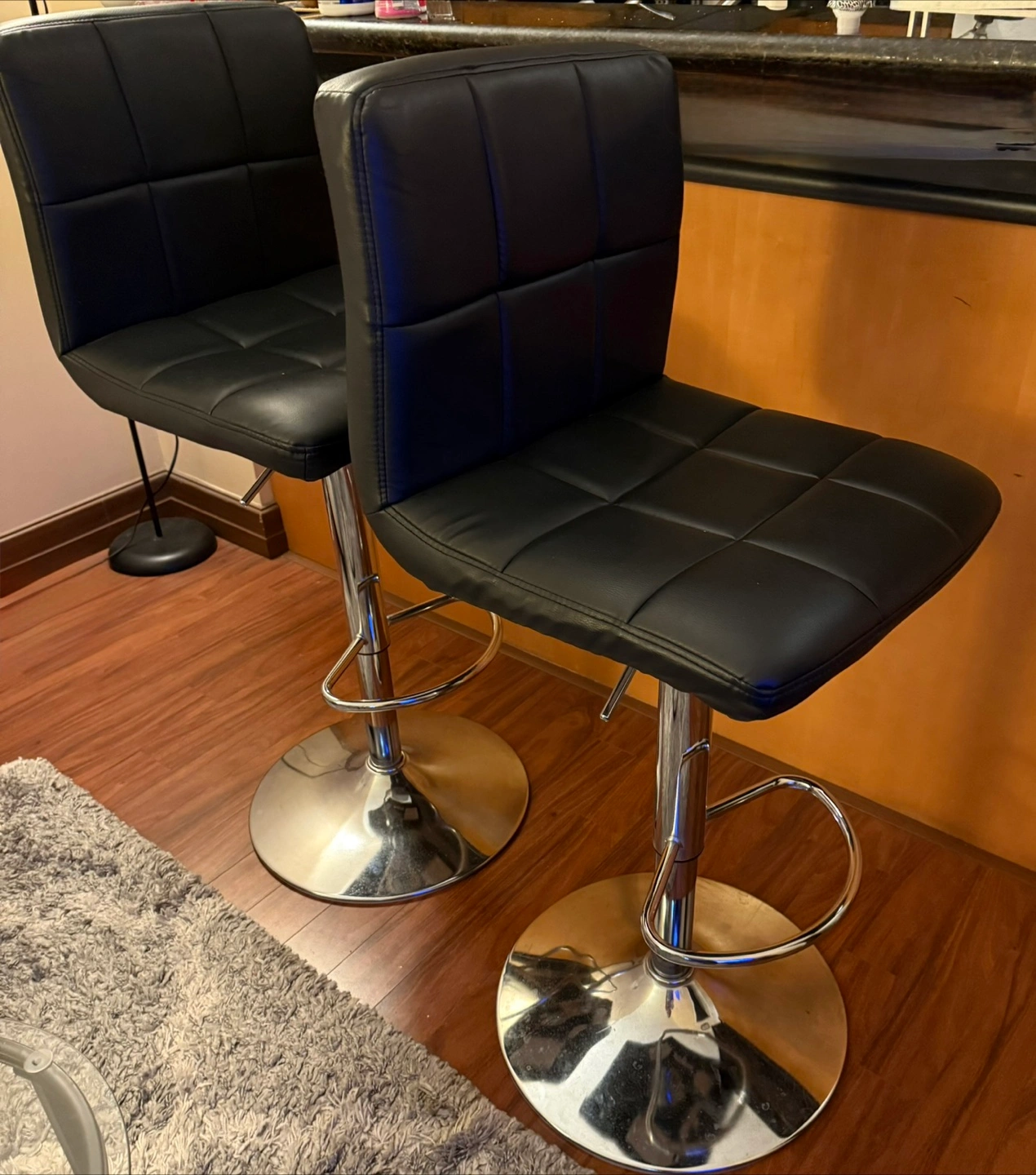 Selling a set of two adjustable bar stools! They're in great shape and would look fantastic in any kitchen or bar area. The black colour is super versatile, and the adjustable height makes them perfect for different counter heights