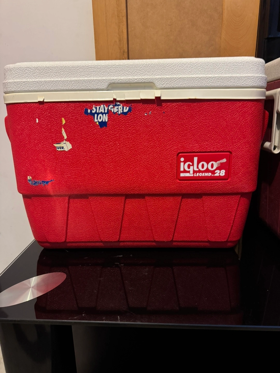 Selling a red Igloo Legend 28 cooler. It's in used condition with some stickers and wear, but still works great for keeping your drinks and snacks cold on those hot summer days!