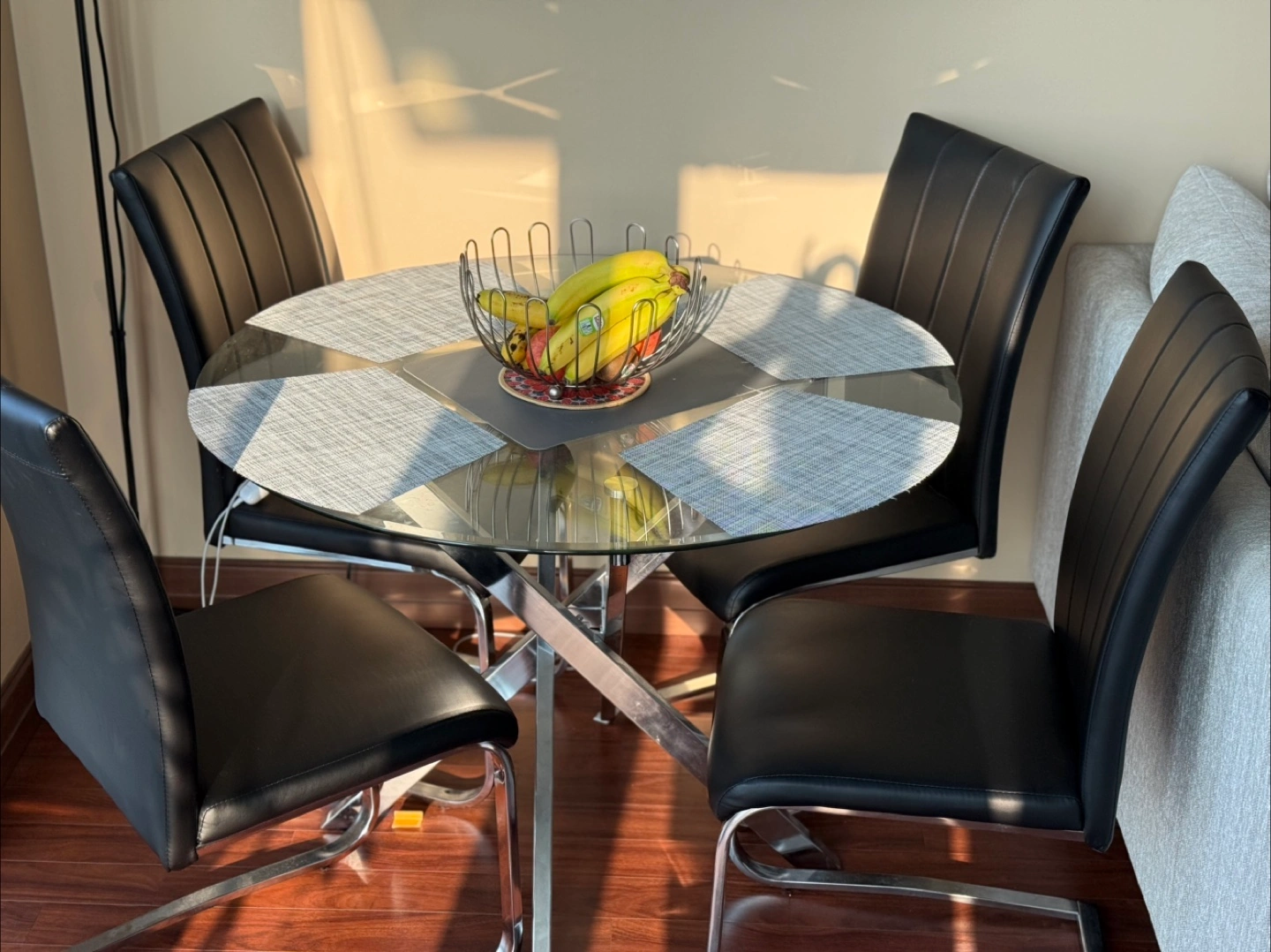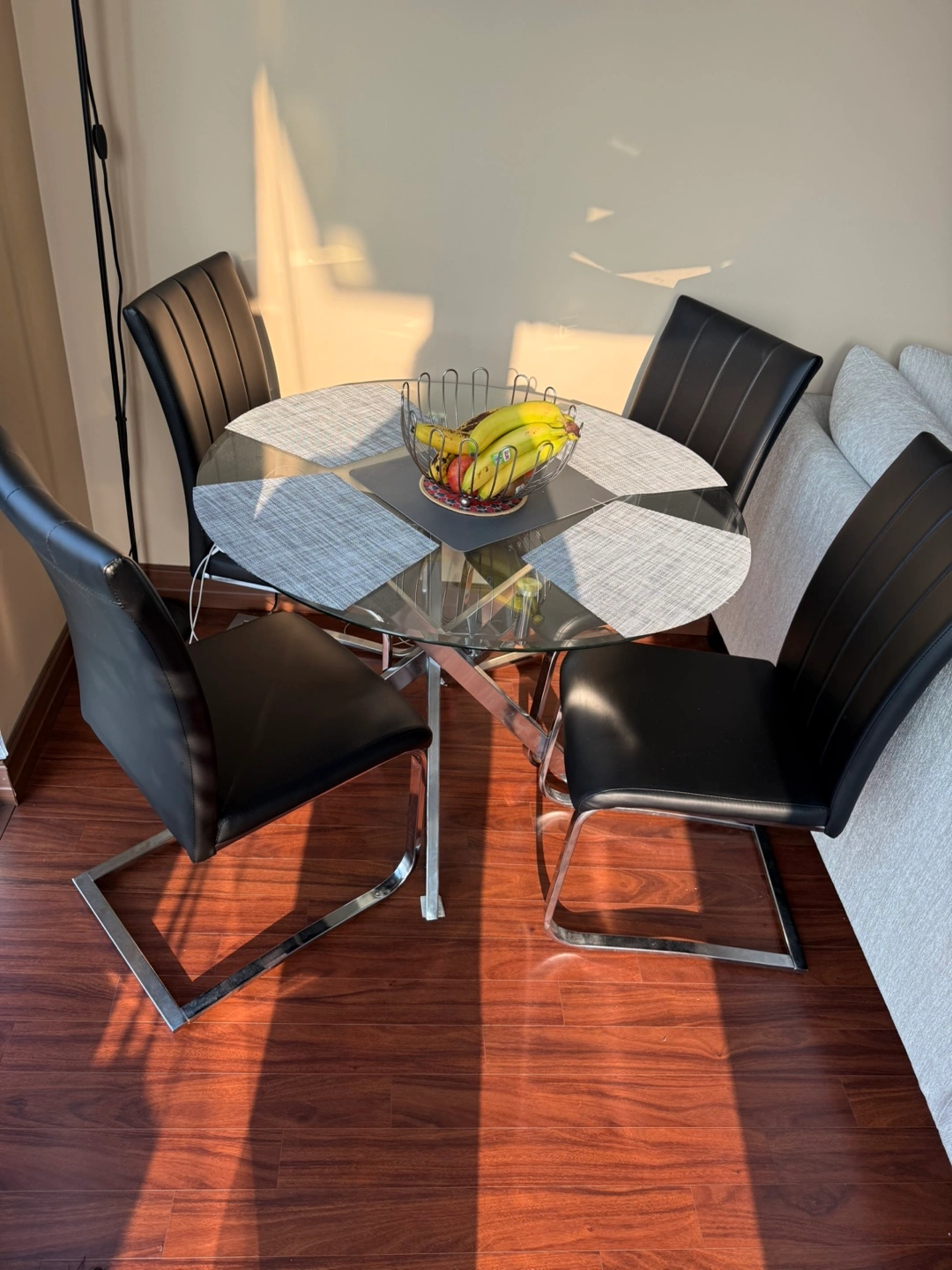 Selling a round glass dining table with four sleek black chairs. The table features a stylish design with a glass top and a chrome base. The chairs are upholstered in black and have chrome legs, complementing the table perfectly. It's a great set for a smaller dining area or kitchen! Smoke free - Pet free household. Available for pickup