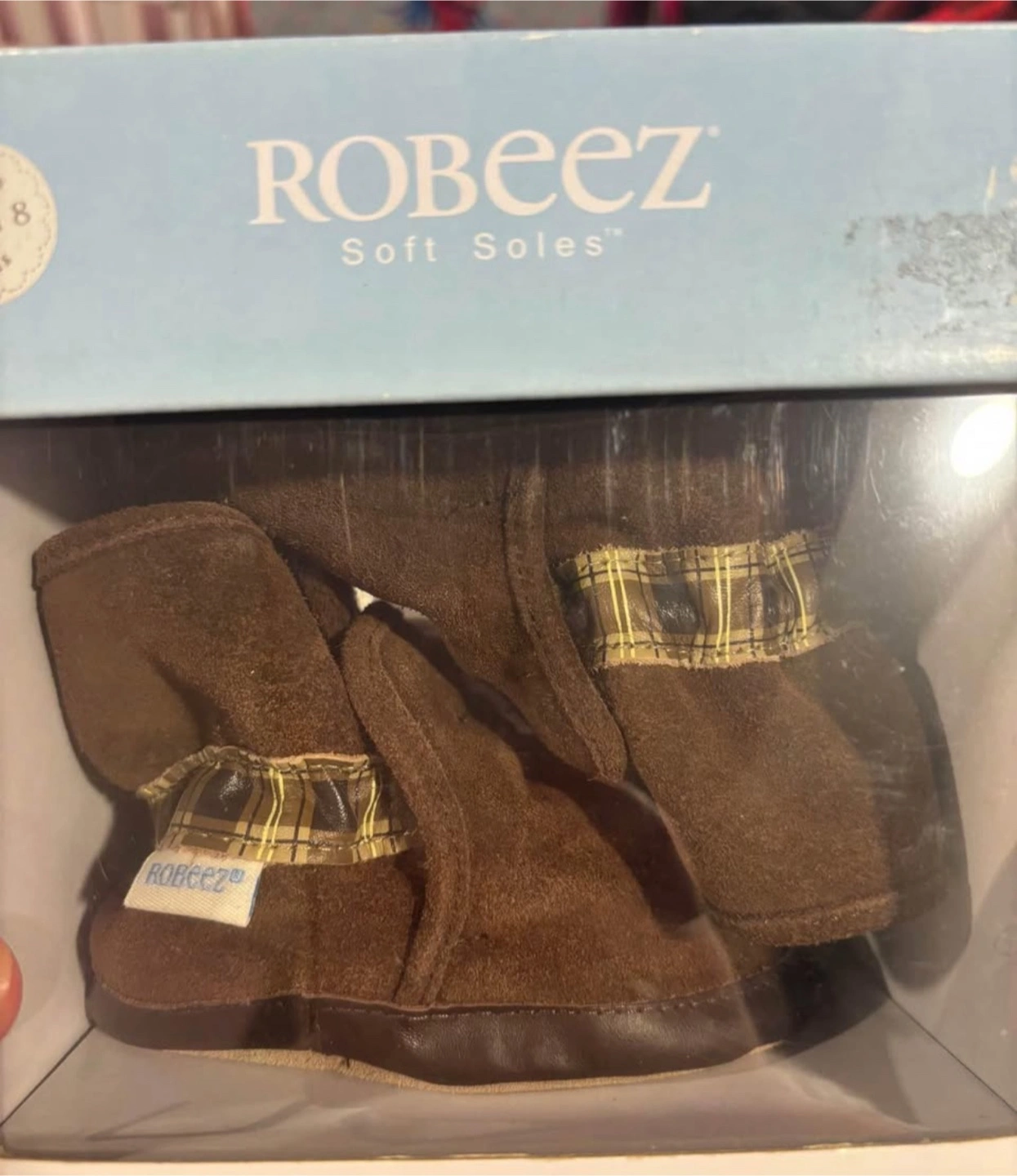 These adorable Robeez soft soles baby booties are brand new in the box! They're a cozy brown colour and have a cute plaid detail. Perfect for keeping your little one's feet warm and snug.