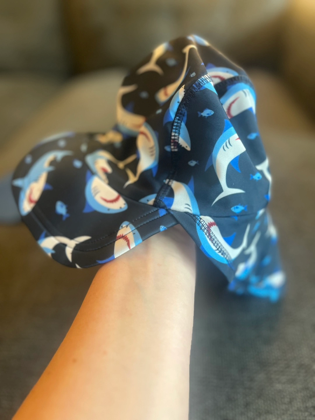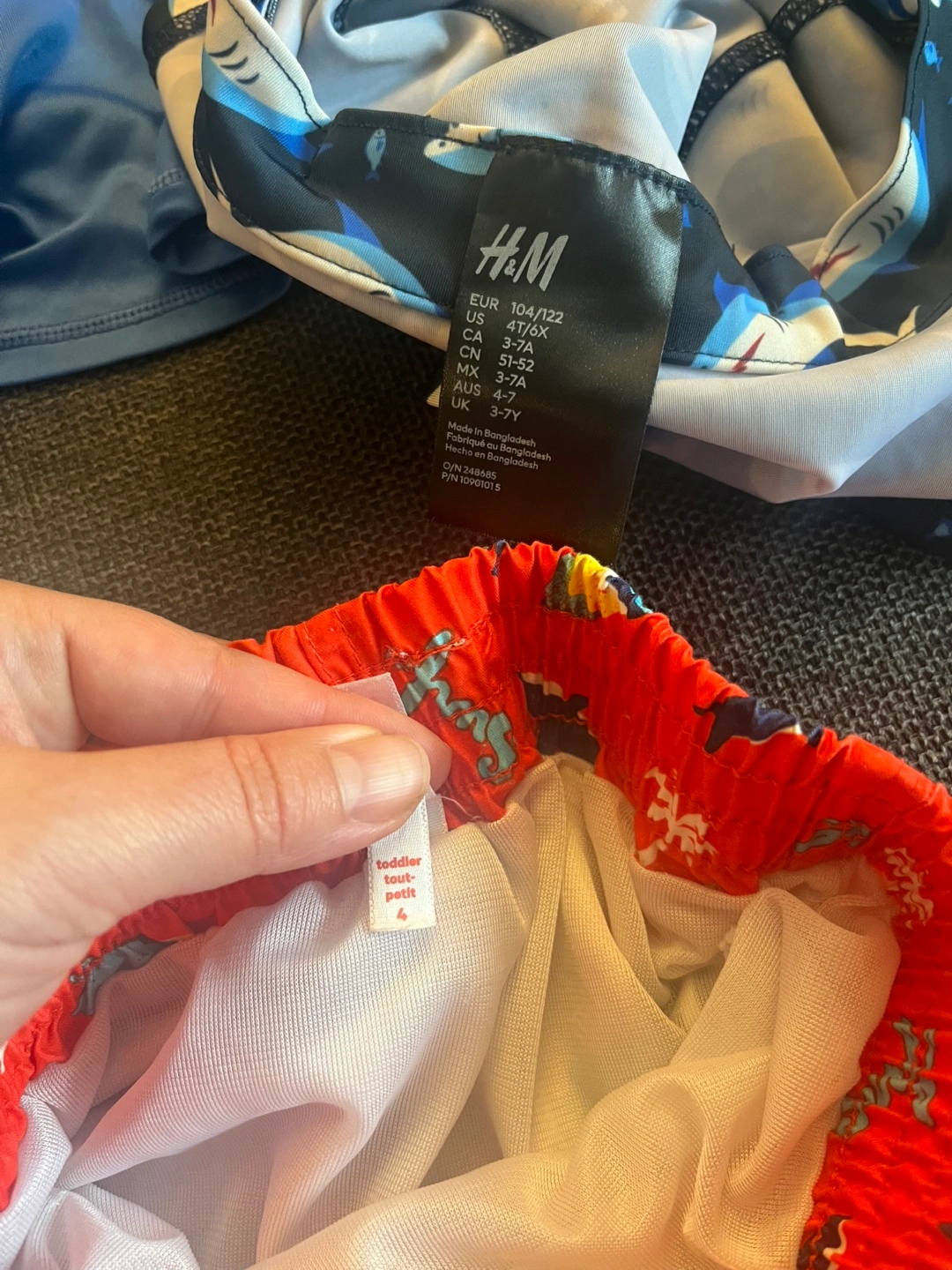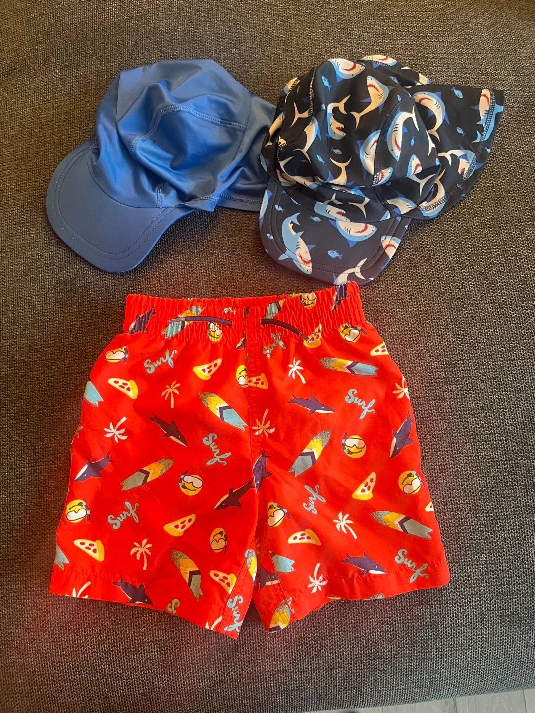 Selling 2 cute H&M swim/beach hats for toddlers! Excellent face, neck and head protection from the sun for little ones. One hat is a solid blue, and the other features a shark print. Size on tag says for ages 3-7 years old. $5 for each hat. Also selling a pair of vibrant red swim trunks with a fun surf and shark pattern, size 4. $5 All items are in great condition! Also selling a pair of kids crocs in my other listing to complete the look! Check them out!