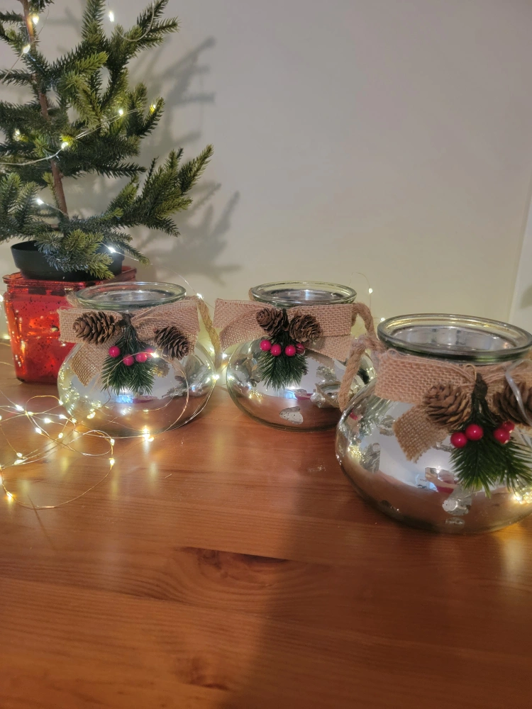 These are some lovely mercury glass candle holders, perfect for adding a festive touch to your holiday decor! They feature burlap bows with pinecones and red berries for a classic Christmas look