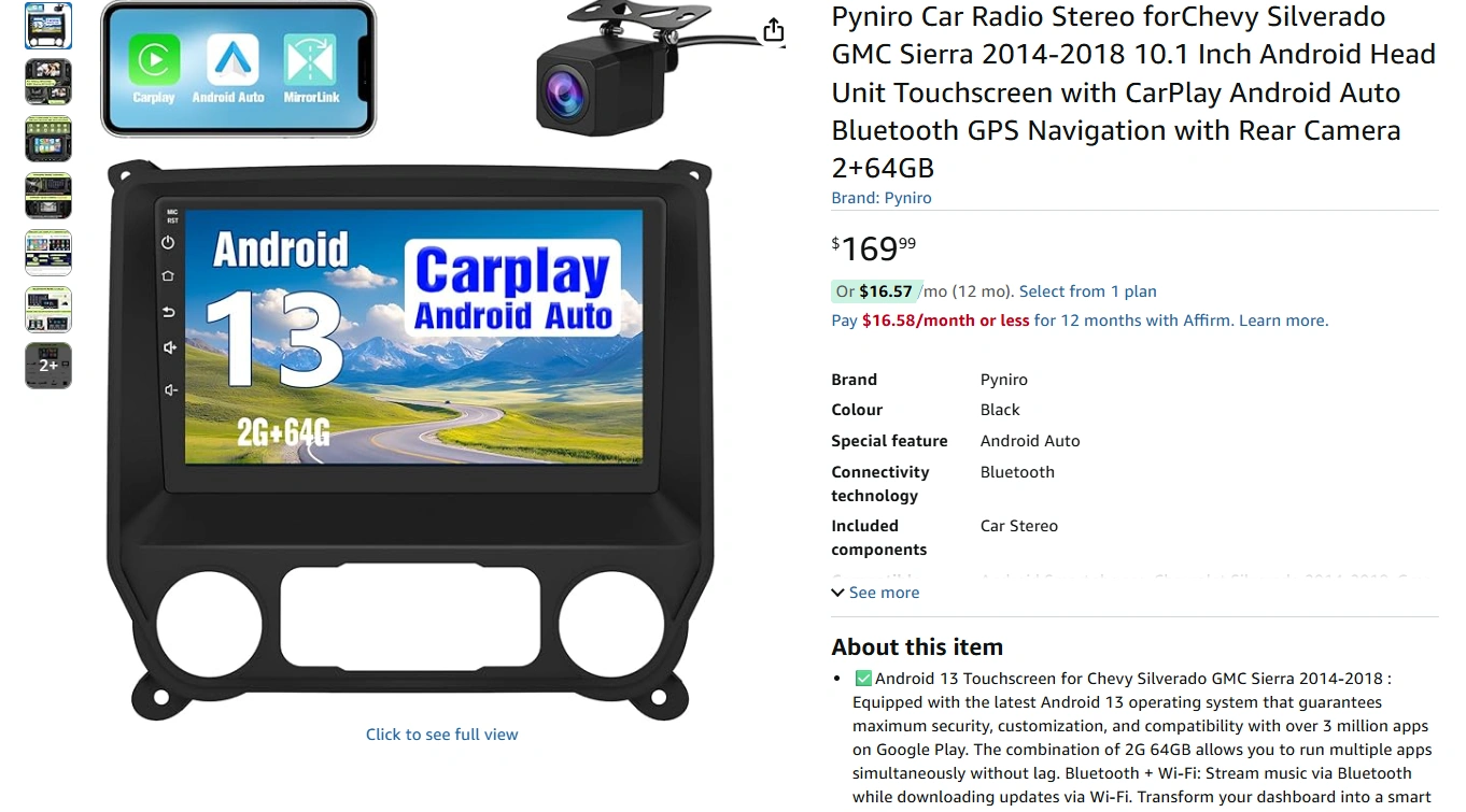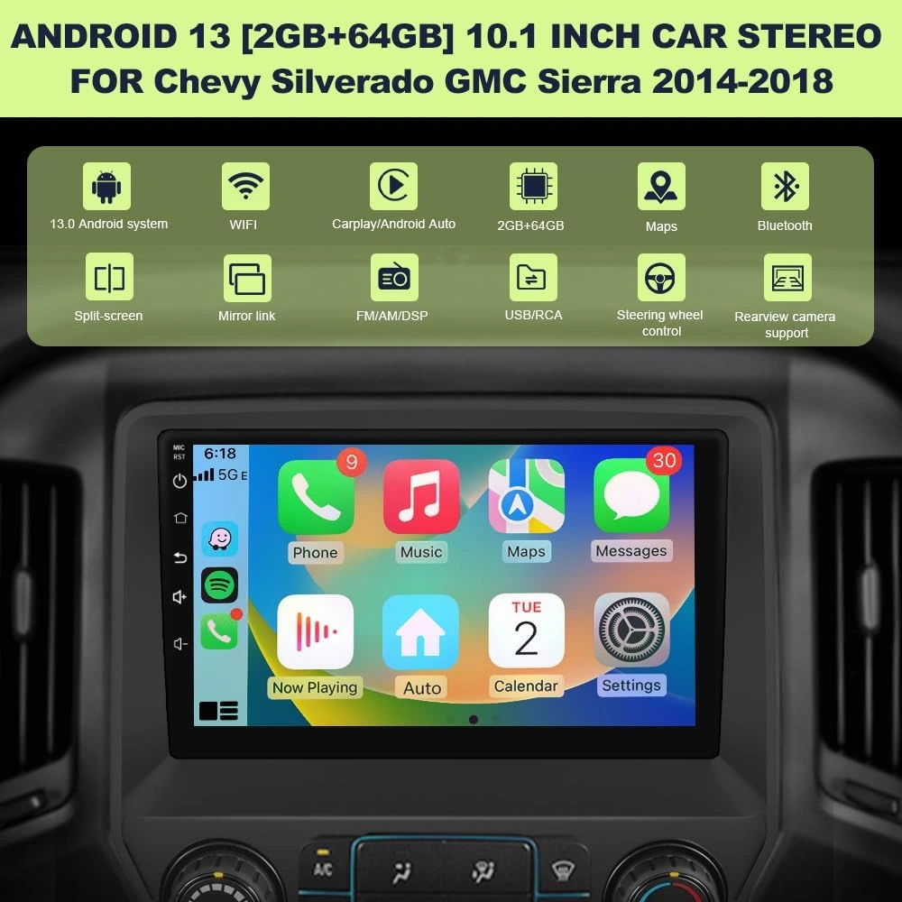 Car Radio Stereo forChevy Silverado GMC Sierra 2014-2018 10.1 Inch Android Head Unit Touchscreen with CarPlay Android Auto Bluetooth GPS Navigation with Rear Camera 2+64GB, Brand New in the Box/Sealed Sells for $170+tax on Amazon https://www.amazon.ca/dp/B0FD7CG489 Features: ✅Android 13 Touchscreen for Chevy Silverado GMC Sierra 2014-2018 : Equipped with the latest Android 13 operating system that guarantees maximum security, customization, and compatibility with over 3 million apps on Google Play. The combination of 2G 64GB allows you to run multiple apps simultaneously without lag. Bluetooth + Wi-Fi: Stream music via Bluetooth while downloading updates via Wi-Fi. Transform your dashboard into a smart entertainment center! ✅Support for CarPlay/Android Auto Wireless/MirrorLink: You can activate iOS CarPlay or Android Auto via a wired or wireless connection. With built-in voice recognition like Siri or Google Assistant, you can control navigation apps, music, messages, and calls directly from the screen without touching the device. ✅Online GPS Navigation: Includes an external GPS antenna (mount it outside the glove compartment for optimal signal). Allows you to use online navigation apps via Wi-Fi, CarPlay, or Android Auto. ✅Versatile Multimedia Playback: Includes multiple connection options: 2 USB ports, RCA inputs for subwoofer, speakers, and a rear camera. Tune in to FM/AM/RDS stations in US or during international trips. Offers 9 preset sound effects (jazz, pop, classical, etc.) and manual equalizer (EQ) adjustments to customize audio in 4 zones: front left/right, rear, and full mode. ✅Reverse Assist: Connect an AHD720P/CVBS rear camera (included) via the RCA port. When reversing, guidance lines will be displayed on the screen. Compatible with original reversing radars (modified radars are not supported). ✅Split Screen Mode: A vibrant 10.1-inch IPS display with split mode: display CarPlay/Android Auto on one side and the rear camera view on the other. HD resolution and 60Hz refresh rate for crystal-clear images while navigating and streaming. ✅2-Y services with technical support. Includes a manual 5 language and professional assembly tools. Component repair or replacement is available in all cases. Personalized support via email and an online platform.