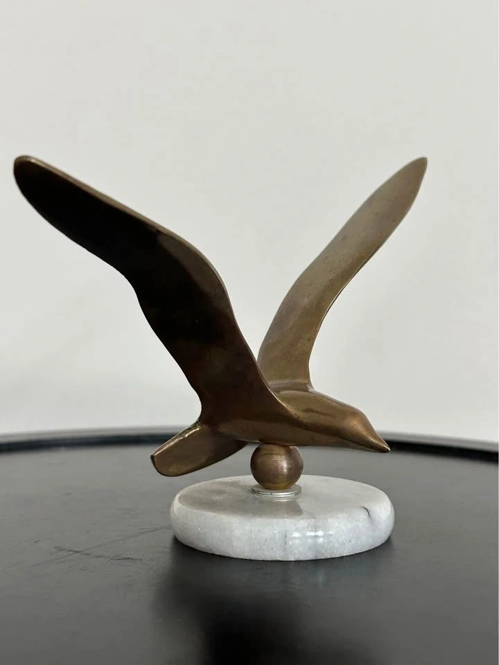 Charming vintage brass seagull figurine mounted on a smooth white marble base. The bird is depicted in flight with wide open wings, giving a sense of movement and elegance. Perfect as a decorative accent for a desk, shelf, or nautical-themed décor. Measures approximately 4” tall. Pick up: Seton area, Calgary. See also my other lots. Open to your questions and suggestions. If necessary, I provide additional photos. These are not new things, so please look carefully at the photos and videos. Sizes are submitted on request and also using a tape measure in the photo.