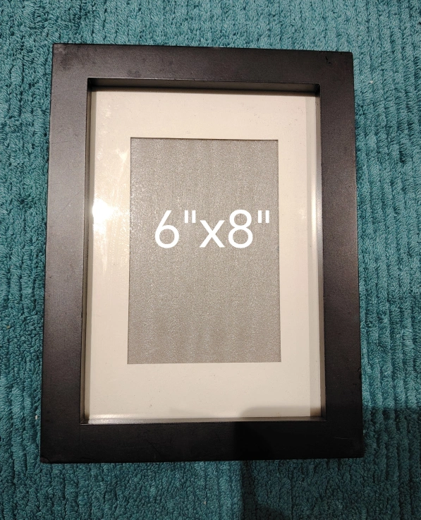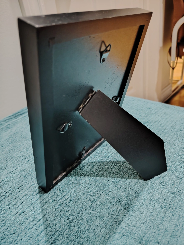 Selling a simple black picture frame. It's a standard 6"x8" size, perfect for displaying your favourite photos or artwork! It has a stand on the back so you can easily place it on a shelf or table. Ready to give your pictures a nice home