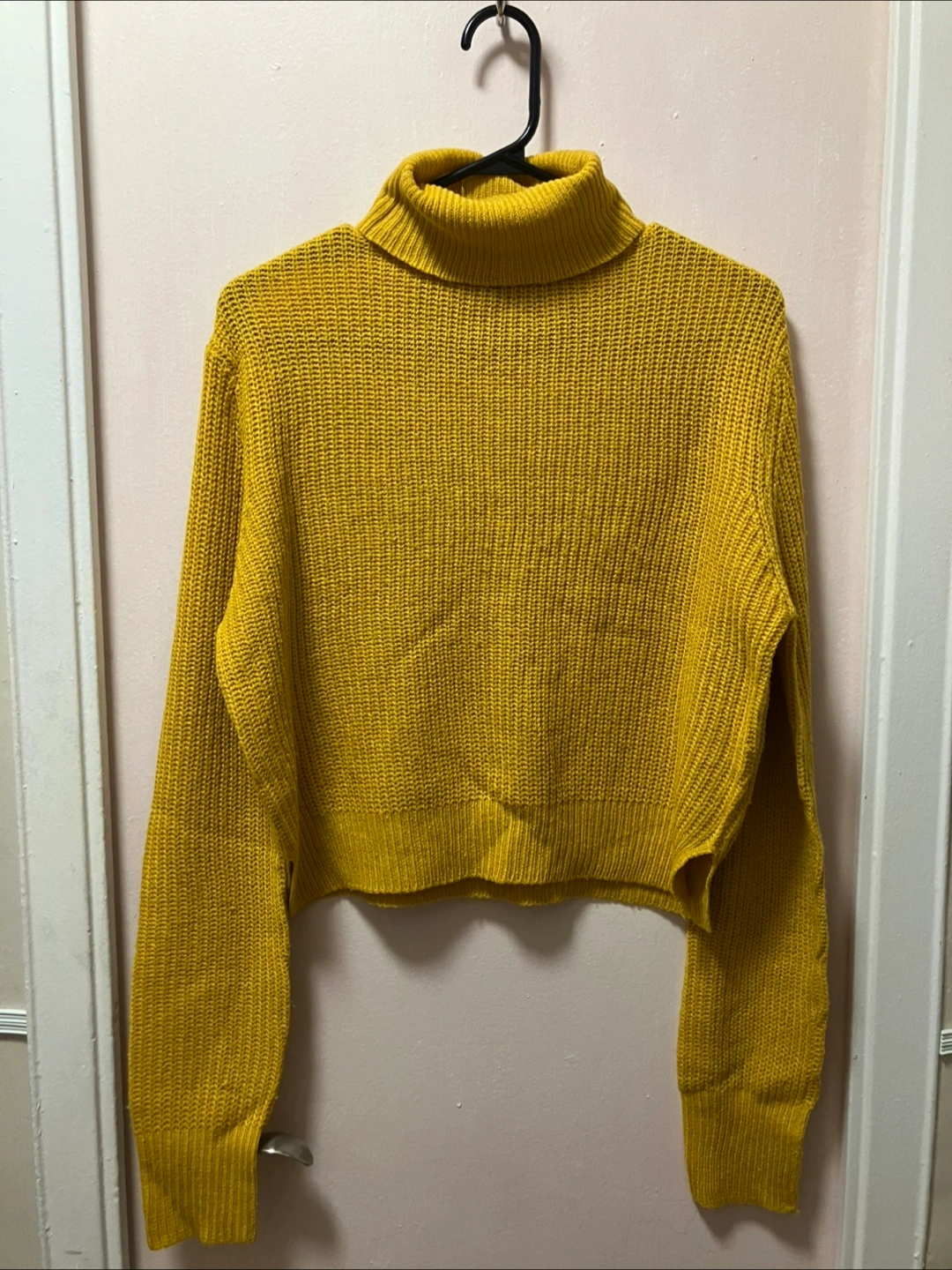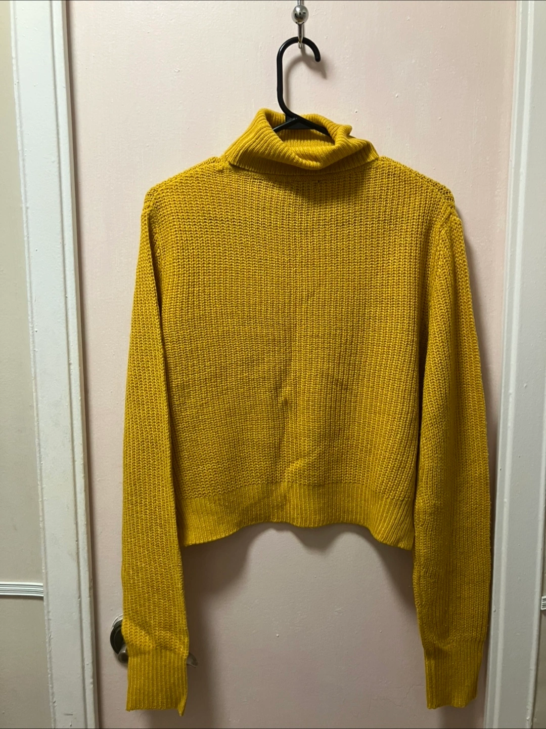 A cozy yellow turtleneck knit sweater, perfect for layering or wearing on its own! It's in great condition and ready for a new home
