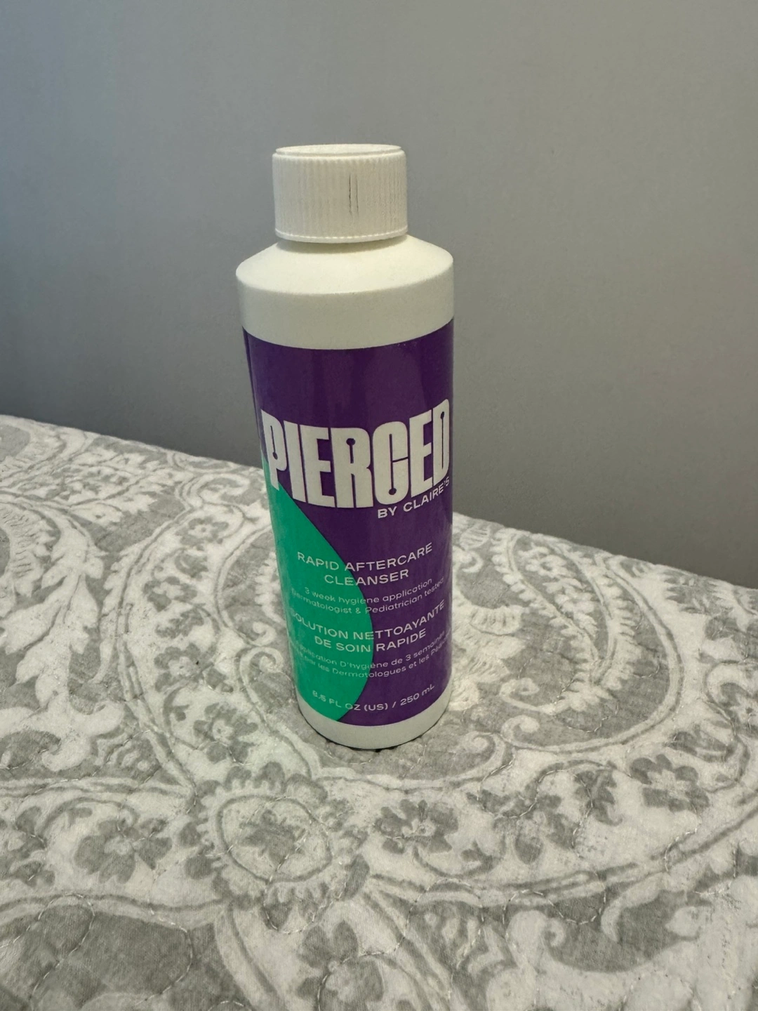 Selling Claire's Pierced Rapid Aftercare Cleanser. It's a 3-week hygiene application to promote fast & effective skin recovery. The expiration date is August 2025. It's a 8.4 FL OZ (US) / 250 mL bottle Retails for 25$